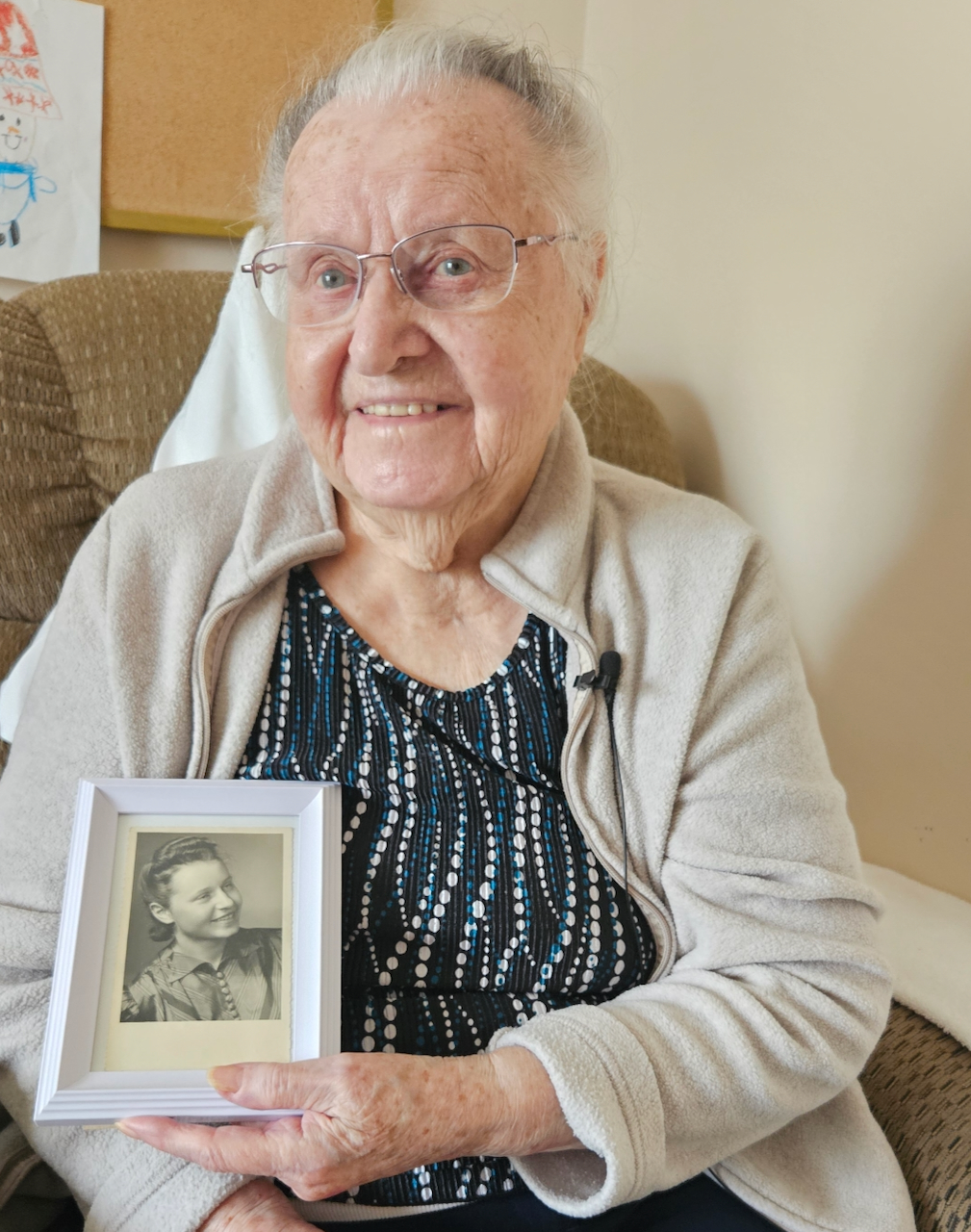 Augusta Bansbach was born October 9, 1921 in the Sudetenland region of Czechoslovakia. She grew up in a small rural community there, living on a farm with her parents and grandparents, alongside her Czech and German neighbours. Educational opportunities were limited for girls at that time, so Augusta’s schooling was complete after 8th grade, and she went to work. When Augusta was 17 the Sudetenland came to the attention of the world: Hitler wanted to occupy the region, and in the 1938 Munich Agreement the British and the French agreed to his demands – it was part of the infamous policy of appeasement. Augusta found herself living in Germany all of a sudden, and as a teenaged girl she became part of the numerous Nazi youth organizations. The war began the following year, when Augusta was 18. Like many in her generation Augusta was trained to work in the war factories of the Third Reich, where she produced timers for bombs. She wanted to do more though, and she signed up for the Red Cross, where she began to tend to wounded soldiers. She did that through the end of the war, coping with the bombings and shortages and other realities of the war. As Soviet troops bore down on them in the confusing and chaotic final months and weeks of the war, Augusta was in the Sudetenland with her aunt, still tending to the troops. Returning German soldiers had told them to get away from the advancing Red Army, but Augusta did not leave, and she and others were taken as POWs by Czech and Polish forces advancing into their area. Augusta did marry in this period, securing her way into the western part of Germany; her husband – a German soldier – was taken prisoner and sent to England. She learned at this time that her brother had been killed as well; with her husband in prison and disconnected from her family Augusta was on her own. Her husband did return, but the marriage was not a happy one, even after they emigrated to Canada with their young family. Eventually they divorced, and Augusta made her own way in her new country. Augusta Bansbach was interviewed by Scott Masters at her home in Kingston in July 2024. We thank Zach Dunn from Global Veteran Stories for his introduction to Augusta Bansbach; see his Veteran Interview Stories here – http://GlobalVeteranStories.com.