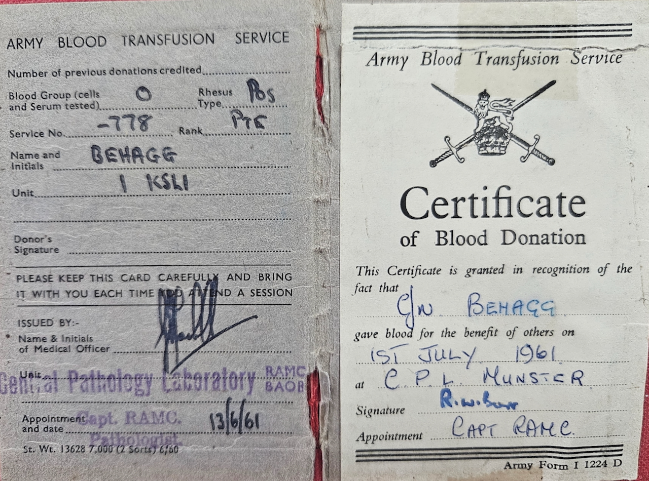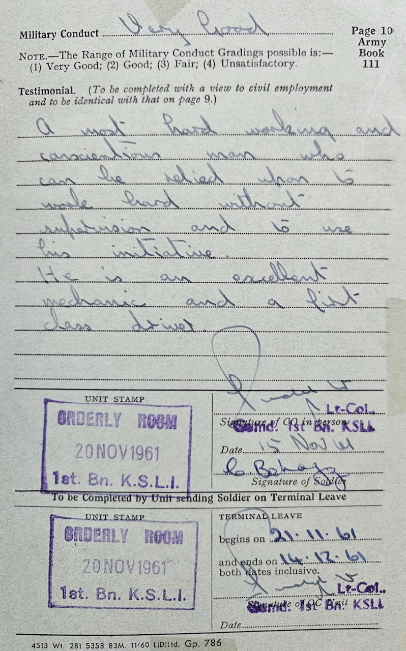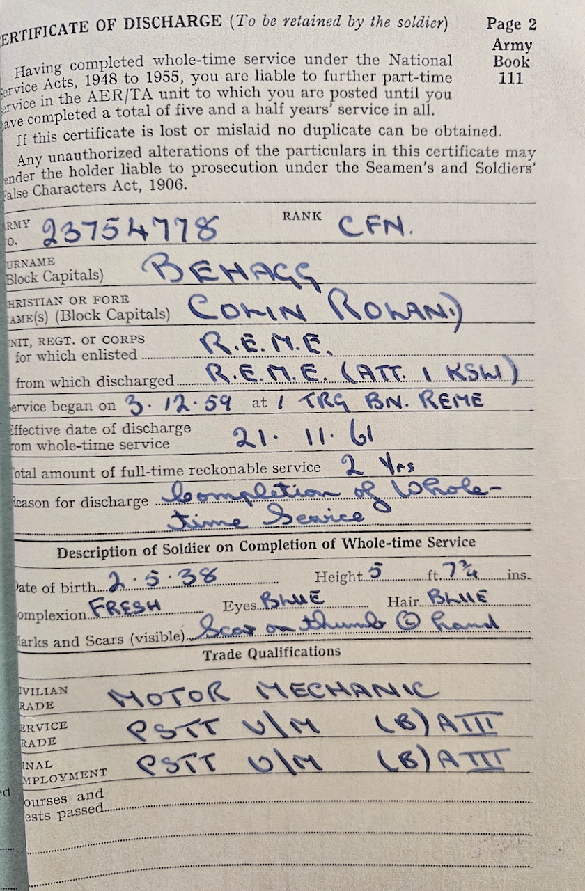 Colin Behagg was born May 2, 1938 in Shirebrook, England, in the county of Derbyshire. He grew up during the wartime years and remembers the rationing and other restrictions of the era; he attended school up to age 16, when he became an apprentice in the auto mechanic trade, and along the way he registered for National Service when he was 18. As he had an apprenticeship, that was deferred until he was 21, and Colin entered the forces in December 1959. After initial training Colin was attached to the King’s Shropshire Light Infantry, and with his mechanical background he was selected for the REME (Royal Electrical and Mechanical Engineers). After a year in England – when he received a special dispensation to get married – he was transferred to Germany, where he was based at Munster. This was the time of the Mau Mau Rebellion in east Africa, so the unit was on alert in case they were needed. When his National Service was complete, Colin returned to the UK, and he and his young wife decided to emigrate, and they decided upon Canada. They sailed to Quebec and made their way to Toronto, where they found an apartment in the city’s west end. Colin found work, and he and his wife moved to Scarborough, where they raised their family. Later Colin relocated to Ajax, and that is where he was interviewed by Scott Masters – at Legion Branch 322 – in August 2025.