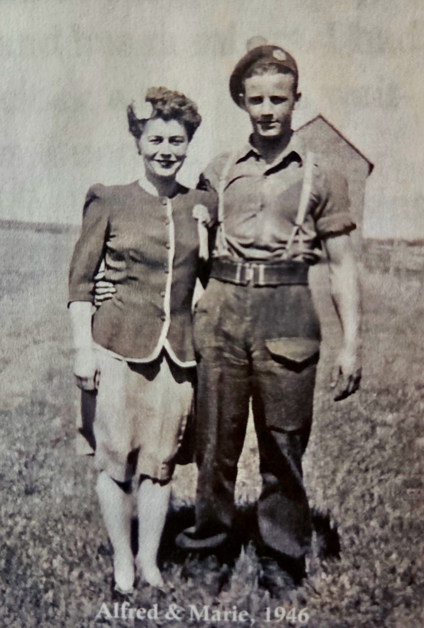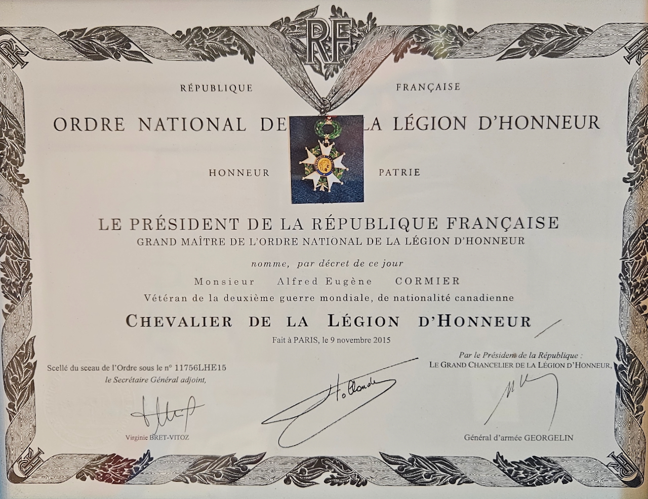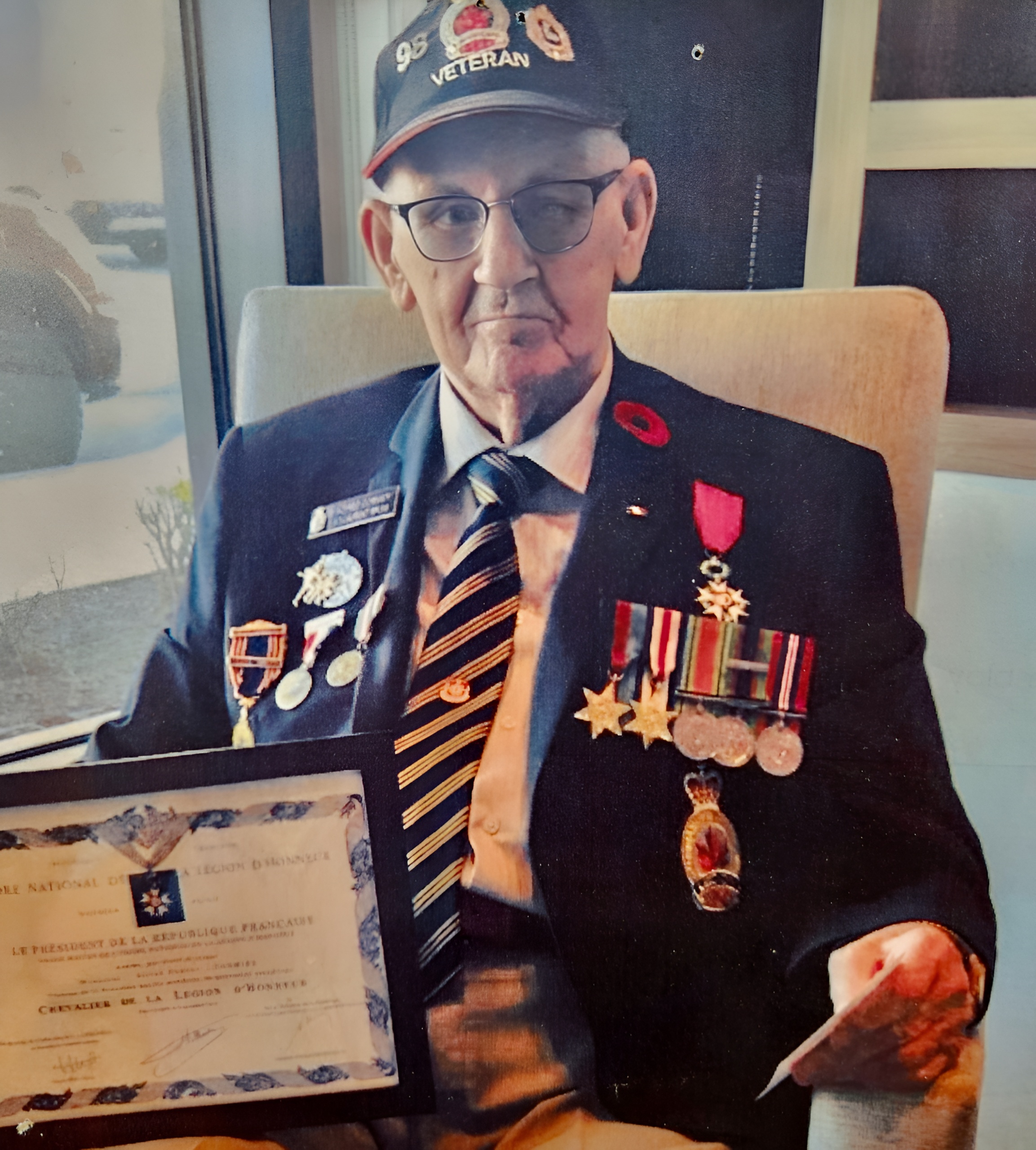Alfred Cormier was born February 25, 1925 in Boston, Massachusetts. The family had Canadian roots, and when Alfred’s father’s health deteriorated, they moved to New Brunswick when Alfred was 7. Alfred grew up there in the small community of Adamsville. As he recalls he left school when he was 13 – so that he could help support his family during the Depression years. Alfred worked on an uncle’s farm during that time, and when he was 16 he decided to join the Canadian army, lying about his age. He got away with it as his birth certificate was in Boston, and when his parents tried to get him back at home he said he’d run away if they tried to stop him. So he and his friend Maynard went to the recruiting office, where they were served bacon and eggs; given the poverty of the time that made a difference! Alfred made it through the recruitment process and swore his oath to the king as he joined the North Shore New Brunswick Regiment, losing his American citizenship in the process. The next step was to board the troop ship, and Alfred went over in a large convoy full of 3rd Division troops; they arrived in Liverpool and headed to Aldershot, and it was there that their training began. The men knew something was on the way when their training began to intensify in spring 1944, and sure enough it was the long-awaited invasion. Alfred and the North Shore Regiment were slated to hit Juno Beach in the first wave, and they did just that. Alfred made it off the beach and into St-Aubin-sur-Mer, where they spent their first night in France. Sporadic fighting in Normandy continued through the next month as the regiment received its orders to take part in the assault on Carpiquet, where Alfred recalls that they lost more men than on D-day. The advance continued along the coastal route, through Belgium and the Netherlands and into Germany itself. Cheering crowds of civilians greeted the Canadian liberators along that route. Alfred was hospitalized for a time in the Netherlands, but apart from that he was never wounded. When the end of the war came, Alfred opted to stay in the Army of Occupation, and he spent much of the next year in northern Germany. It was then that he returned to Canada: first he was in New Brunswick, where he married, but opportunities were limited, so he and his wife made the decision to move to Montreal, where Alfred found work with Eaton’s. Alfred Cormier was interviewed by Scott Masters at his home in Ste-Anne-de-Bellevue, Quebec in October 2025.