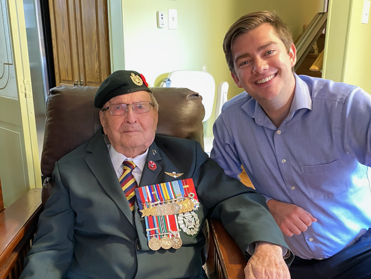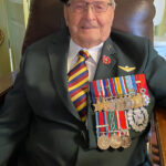 George Couture was born November 25, 1924 in Wilkes-Barre, Pennsylvania. His father was a Great War veteran from Selkirk, Manitoba who headed south when work was tough to find after he returned to Canada from his overseas service. They stayed there for four years before returning to Canada, where the family confronted the realities of the Great Depression. George went to school during this time, though he left after Grade 8 and took work in a steel foundry, using the money to help his family. George saw the war come while he was there, and when he turned 18 he chose to volunteer. His initial training took place in Manitoba, and he was assigned to the Royal Winnipeg Rifles. His brother Bob joined up too, and the two of them went overseas together on the Ile de France. They arrived in England in 1942 and ended up at Aldershot, though George’s brother went on to Italy. George spent his time in England in training, and on June 6, 1944 he was part of the D-Day landings in Normandy, storming the beach in the second wave. He and the other Winnipeg Rifles pushed inland in those first few days, with George finding himself in a Bren Gun carrier at one point; they were targeted by a German gun, and the carrier was destroyed, with most of the men killed in the explosion. George was badly injured and taken prisoner at this point, and was later sent to Stalag 11B. Conditions there were poor: crowded barracks, limited food, and hard work characterized day-to-day life, as did the tedium. As the Allies approached from east and west, George was one of the many POWs forced to endure the infamous Long March as the Germans were on the retreat. The conditions were brutal, and George recalls the exhaustion, starvation, and sight of his fellow POWs being shot for the slightest infraction. George was liberated by the advancing Allied armies in May 1945 and flown back to Britain, where he recovered in hospital. Eventually he made his way back to Selkirk, Manitoba, where he chose to re-enlist a few years later. George found himself in a second war, this time in Korea, and there too he was wounded in battle fighting against Chinese forces. When he came home, George settled down, marrying and raising his family, and putting those days of war and conflict behind him. George Couture was interviewed by Zach Dunn of Global Veterans’ Stories, and we thank Zach for sharing this video with us so that Crestwood students can hear another story from a Canadian veteran!