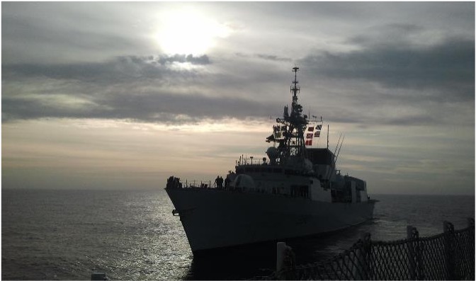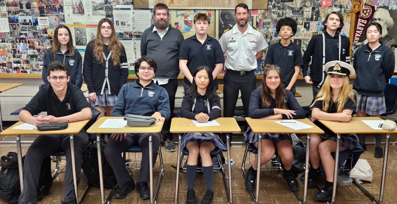 LCdr Andrew Cumming was born in Guthrie, Ontario, just outside Barrie. He attended St. Andrew’s College and studied engineering at the University of Toronto. He then entered the working world, and unhappy with what he encountered he chose to join the Canadian Forces. Given his background he was drawn to the navy, and he has since made a career there. He began that career with basic military training, moving on to more specialized naval classes and engineering operations, where he has grown to be familiar with the complex inner workings of Canada’s many types of naval ships. Andrew has also been involved in a number of deployments, including Operation Caribbe, where he helped to police the Caribbean region by being on the lookout for drug smuggling and other illegal activities. He was also assigned to Operation Reassurance, where Canada and its NATO allies are working to deter Russian aggression in Ukraine and the Baltic states region. Similarly the Canadian navy worked alongside its NATO allies to patrol the Mediterranean as part of Operation Sea Guardian, searching for refugees who were often in unsafe watercraft. In 2024-2025 LCdr Cumming attended the Canadian Forces College in Toronto, and he took some time one afternoon to share his story with Mr. Hawkins’ Grade 10 history class.