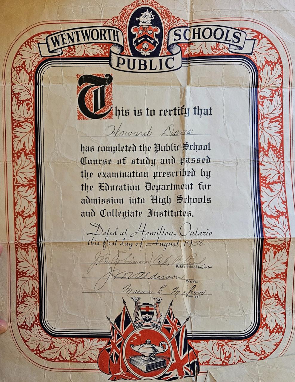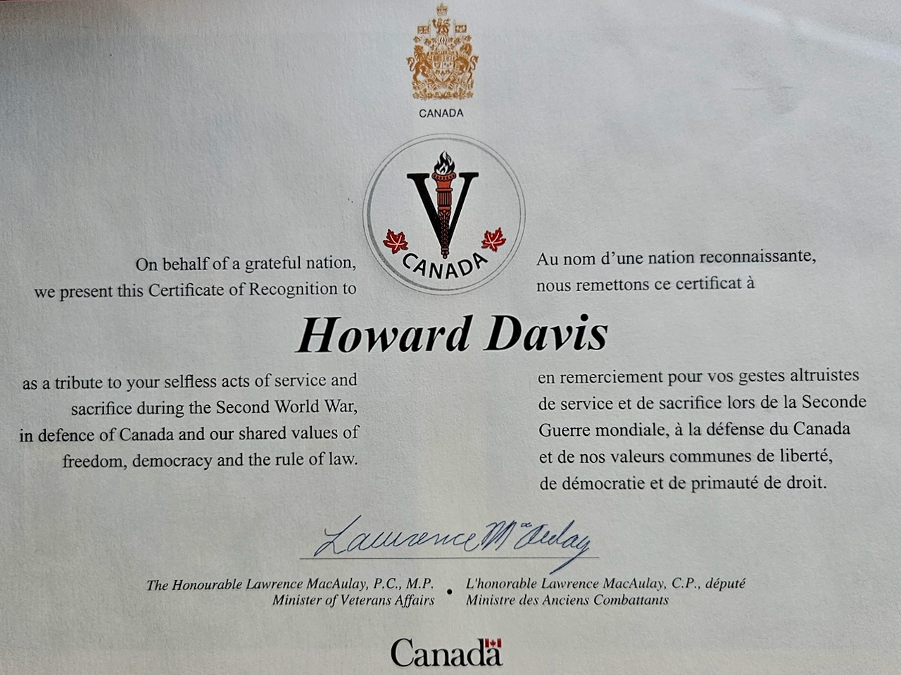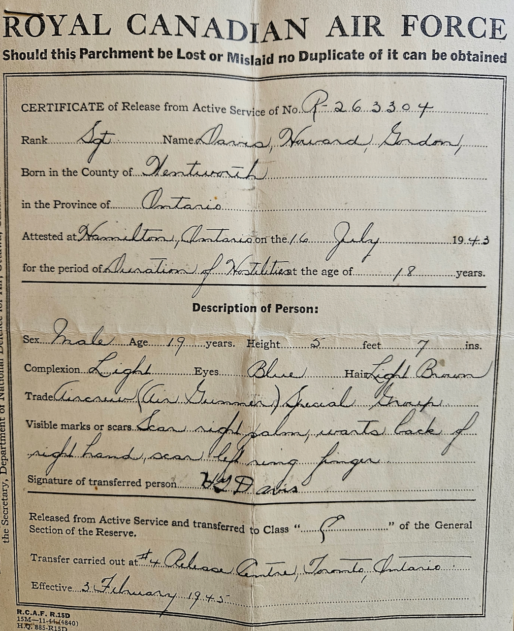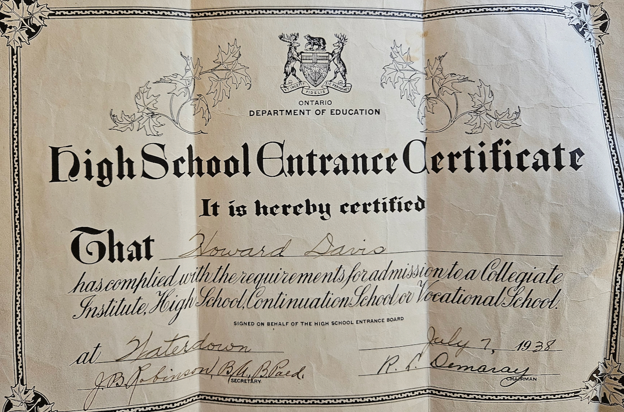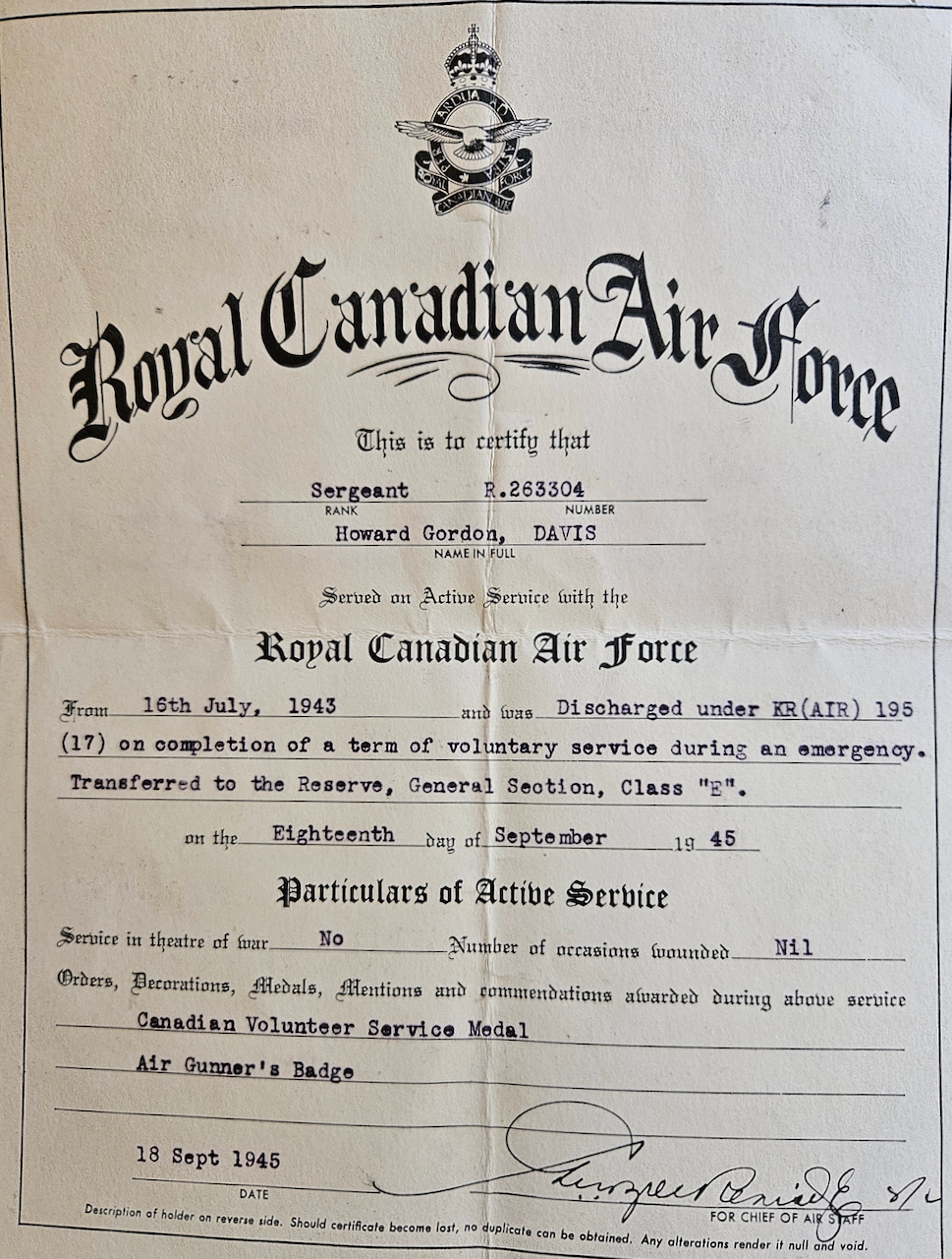 Howard Davis was born July 7, 1925 in Wentworth County, Ontario. His father was a veteran of the Great War, and his mother was a “country girl” as he recalls. Howard had two brothers and a sister, and they grew up in a rural community, attending the one room schoolhouse in Valens, Ontario. Howard did not finish high school; he went to work on local farms in a bid to support his family during the Great Depression. With the coming of the war – and the expectation of his call up – the 18 year old Howard volunteered for the RCAF. He reported to Manning Depot in Toronto and was soon into the British Commonwealth Air Training Plan, attending schools in Aylmer, Ottawa, and Mont Joli. In that last school Howard learned gunnery training. He and the other men would go up in their Fairey Battles and fire at the drogues for target practice; Howard recalls that this was very difficult, and that they spent most of 1944 going through the steps of the BCATP. That lasted into 1945, as the war was getting into its final stages. After all that time getting ready for the fight, Howard began to realize that he was not going to get his chance. The men were asked to volunteer for the Pacific War, and 97 of the men at Mont Joli committed to that, but the atomic bombs obviated that possibility. Howard would be demobilized in short order, and after a short stay at home, he went into the construction industry, where he became a crane operator. He also married and raised a family, and together they found their way in postwar Canada. Howard Davis was interviewed by Scott Masters at his home in Barrie, Ontario in February 2024. We thank Zach Dunn for the introduction, and you can see his interviews here – https://www.youtube.com/c/ZachDunnTV/playlists.