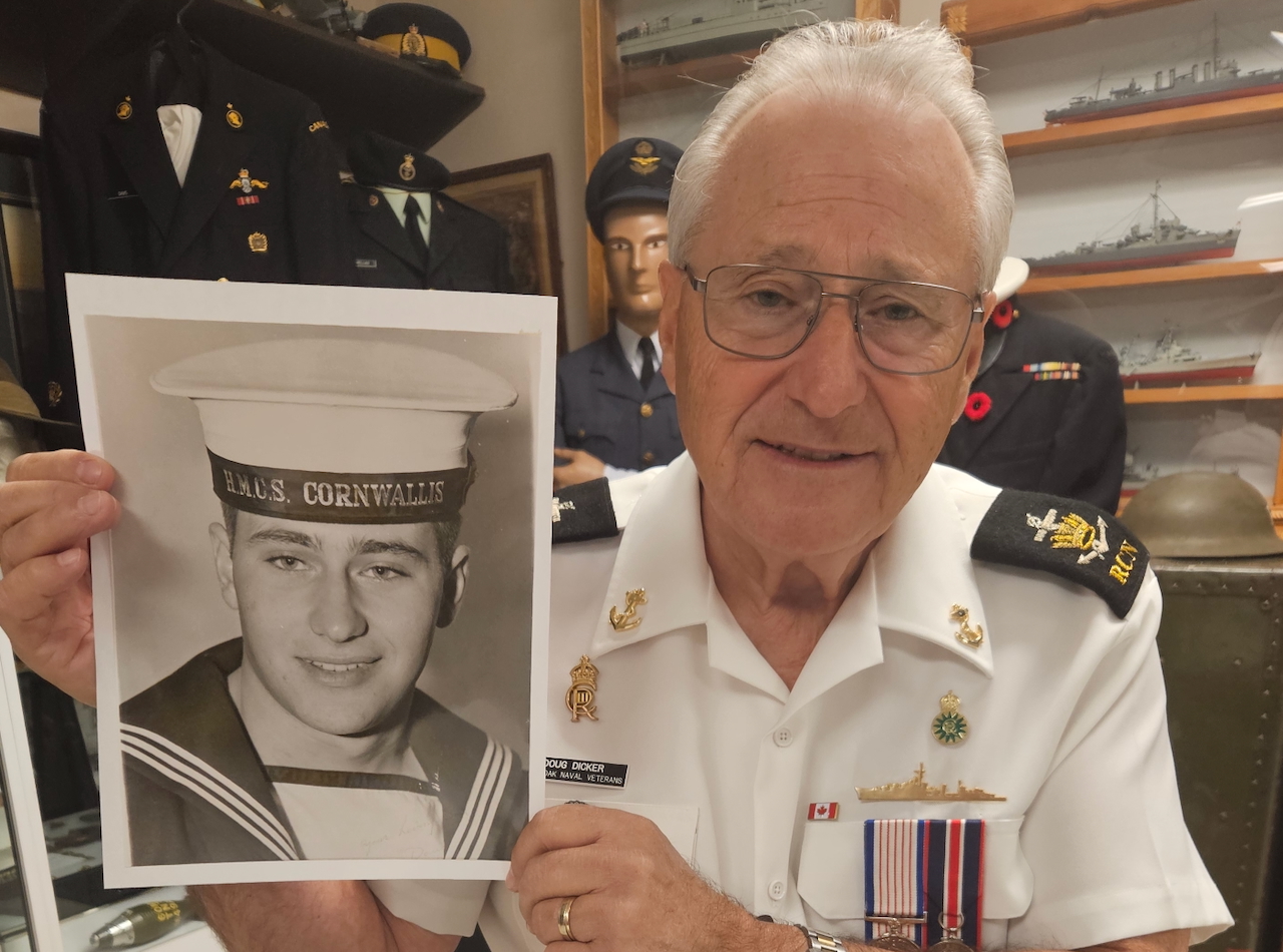 Doug Dicker was born April 19, 1950 in Temiskaming, Quebec, where his father worked in a local mill. Doug’s father had come to Canada from England in 1925, and he was a veteran of World War Two who served all six years in that conflict as a soldier in the Royal Hamilton Light Infantry.  While overseas he reconnected with Maud, a female friend from his early life, and the two of them struck up a romance, marrying in 1942.  Doug’s mother came to Canada right after the war, one of thousands of war brides to do so.  They thus began their life in Canada, with Doug coming along a few years later.  Doug had heard stories of the war and military growing up, so he opted to join too.  The Cold War was in effect at that time – as was the reorganization of Canada’s military:  what had been the Royal Canadian Navy was now the Canadian Armed Forces Sea Element.  Training began at HMCS Cornwallis and Camp Borden, where he completed the 3 months of Logistic training, becoming a Supply Technician.  In short order Doug was assigned to destroyer HMCS Skeena, where he would serve for the next 14 months.  During that time they did multiple work-ups to ensure everyone knew the ship, knew their role and could perform their responsibility without hesitation. Then came exercises for the ship to perform to task whether alone or with other ships or submarines. Doug’s Action Station was on the flight deck as a helicopter firefighter and rescue. Each time the helicopter was departing or arriving, they were on the flight deck dressed with hoses charged ready for any emergency. In addition Doug did shore patrol – and he even helped with the daily rum ration that was ongoing at that time. Doug’s naval career was relatively brief; his time in the service coincided with amalgamation, and morale was low and long-term career prospects were dim.  He made the decision to leave, marrying and starting a family, and beginning a successful career in the construction industry.  The allure of the military remained though, and in 2008 Doug connected with the Royal Canadian Naval Association, reaching out to other service members and his community through his volunteer and remembrance efforts.  Doug Dicker was interviewed by Scott Masters at Legion Branch 60 in Burlington, Ontario, courtesy of the Burl-Oak Naval Veterans, and this video was edited by Crestwood student Chaeni Lee.