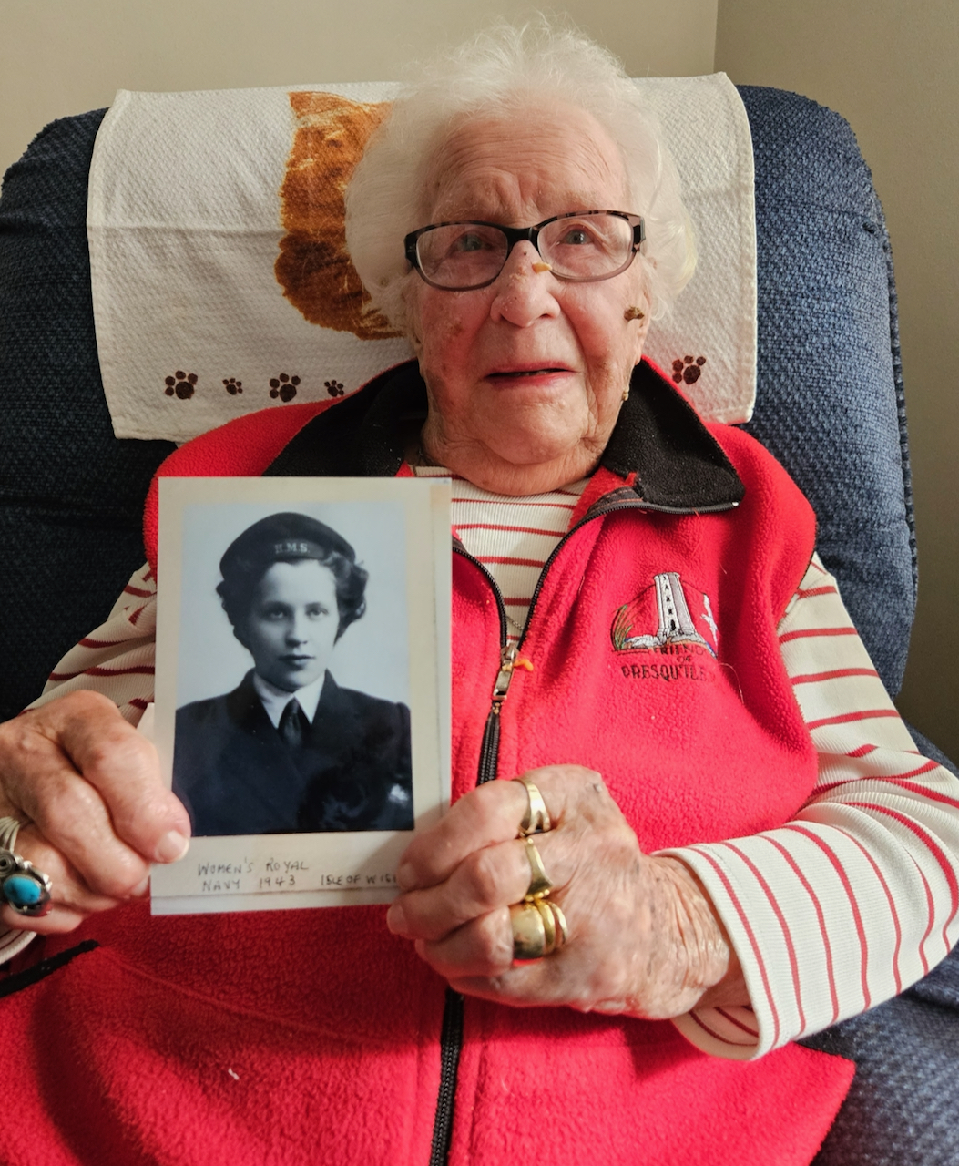 Joice Foley was born April 1, 1924, in Wick, in Hampshire, England. It was a rural area where she has fond memories of the animals in the fields – and of the long walks to school and everywhere else. Joice’s parents were in service, an occupation they expected her to join too. Joice consequently left school when she was 15, but she decided to pursue her own path: she was initially a waitress, but the coming of the war set her – and her whole generation – in new directions. Joice decided to join the Royal Navy, and she became a WREN, serving initially at Portsmouth and later at the Isle of Wight. Her duties included work in the officers’ club, and later the Fleet Postal Service, where Joice took on the role of letter carrier during her time on the Isle of Wight. Along the way she met a Canadian soldier named Fred, who was stationed at Camp Bordon. The two of them began a relationship and were married in 1944, and by VE Day 1945 Joice was pregnant. The decision was made to go to Canada: Fred went first and found work and a place to live, and Joice and thousands of other war brides and children followed in 1946. Joice and Fred raised their young son and created a life for themselves in Montreal, helping to build postwar Canada in the process. Joice Foley was interviewed by Scott Masters at her home in Brighton, Ontario in February 2024; we thank Zach Dunn for the introduction, and you can see his interviews here – https://www.youtube.com/c/ZachDunnTV/playlists.