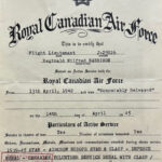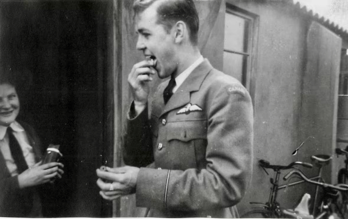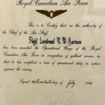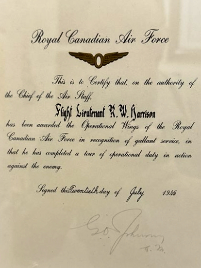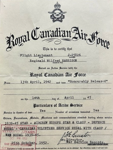 Reginald “Crash” Harrison was born August 16, 1922 in Pheasant Forks, Saskatchewan, not too far from Regina. Reg’s parents had come to Canada from Yorkshire not long before the Great War, and Reg’s father returned to Europe as part of the Canadian Expeditionary Force to fight alongside his brothers still in England. He came back to the farm, though his health suffered as a result of the brutal conditions in the trenches. Reg grew up against the backdrop of the decades between the wars, when the Great Depression was the dominant fact of life. The dust storms and grasshoppers and men riding the rails were all facts of life for Reg. Conditions in rural Saskatchewan were difficult as plumbing and electricity had yet to reach them, and the local one room schoolhouse only went to Grade 8, after which Reg did correspondence courses to get through Grade 10. In 1941-42 he had to attend pre-enlistment school to prepare for the RCAF. After that Reg went into the British Commonwealth Air Training Plan, and his first stop would be at Manning Depot, followed by ground and elementary flying schools at Virdon and Yorkton, and Yorkton was the base not too far from his home! Reg’s time in the BCATP lasted a little over a year, and by the summer of 1943 he was on his way overseas. Reg made the crossing on the Louis Pasteur, and once in England he and the other RCAF airmen were sent to Bournemouth. Soon he met the rest of his crew, and their time together began, initially flying Halifax bombers in 431 Squadron out of RAF Croft. It was a difficult task for the men on those air crews, as they confronted flak, fighters and fear – and freezing cold temperatures. They would lose friends along the way too, and for Reg that meant the loss of his good friend Buddy. On his first “trip” Reg flew with an experienced pilot on a mission to Amiens; one bomb did not fall though, and on the landing it dislodged and exploded, killing and maiming the crew. Reg ended up in the famed Guinea Pig Club, recovering from serious phosphorus burns and receiving early skin grafts. Even with that, his war was only just beginning. Later, they were heavily damaged on their 17th mission, and Reg describes how they reported to the Central Medical Board in London – and that five of the seven were found unfit for further service. Reg and the tailgunner continued on though, and they were converted to Lancasters at that time. They went on to serve in missions centred on the Normandy campaign, and Reg remembers a mission the night of June 5-6 itself, where he saw the gliders on their way across the Channel. Reg earned his nickname over his RCAF career – he was involved in 4 crashes which he was lucky to walk away from: “Crash” is a suitable sobriquet! Reg’s war finished early in 1945, and when he returned to Canada he went to meet his friend Buddy’s fiance Jean – after his “little voice” urged him to do so. The two of them shared reminiscences about the man they both had known, and their own relationship developed too. Reg and Jean eventually married in their own right, raising their own family and playing their own role in potwar Canada.