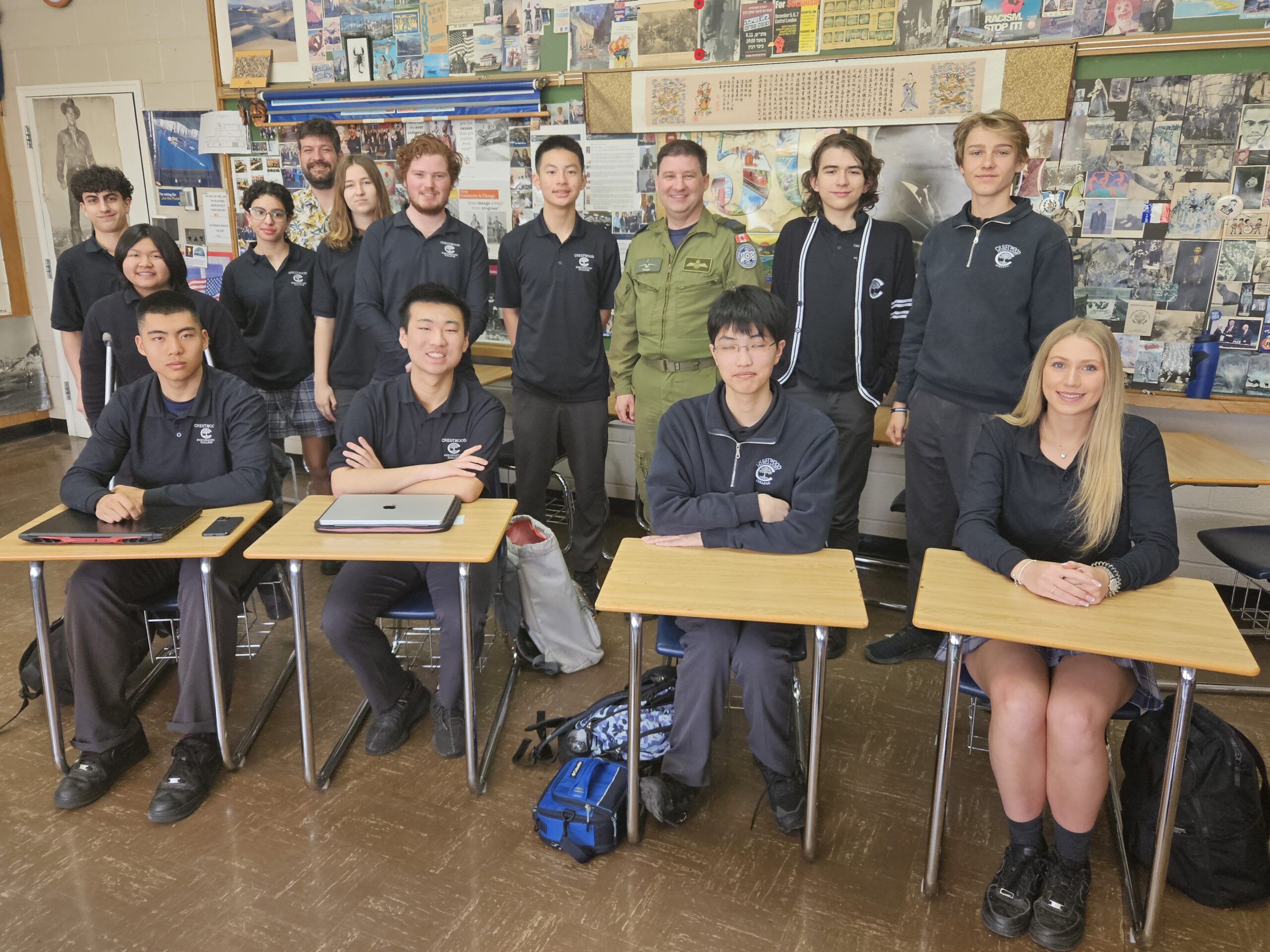 Richard Hough was born in Napanee, Ontario, where he grew up on a dairy farm. He wanted to be a pilot, and that led him to join the Canadian Forces; while his dream of pilot did not work out, he did qualify as a navigator, and he set off to RMC to study engineering. He earned his degree in space science and went on to begin his navigator training, ultimately assigned to a C-130 Hercules squadron. His initial deployments would take place in Afghanistan, where he would deliver troops and supplies. He worked as an air planner, aircrew and mission planner for other missions out of a support hub and also worked on the ground in Kandahar as a staff officer at the airbase. During his last deployment, he was involved in the integration of air effects with the army, including assisting in the introduction of Chinook and Griffon helicopters and Heron UAVs into the theatre of operations. That involved working with multinational partners extensively (British, American and Regional HQ). All of this certainly was dangerous, whether on the ground or in the air, when the Hercules would go low and slow on drops, forcing the crew to be alert to potential threats on the ground. They also had to deal with all sorts of other difficult conditions: heat, turbulence, air sickness, and long flight times. Given the nature of Canada’s military role, he would also take part in ramp ceremonies, returning fallen Canadian soldiers to their families in Canada. He also did a tour in the United States, and did numerous deployments in Canada, including Ice Storm 98, Red River Flood work, and Operations Nunalivut and Boxtop in the Arctic. Major Hough spent 2023-2024 at the Canadian Forces College in Toronto, and during that time he spent an afternoon with us at Crestwood.