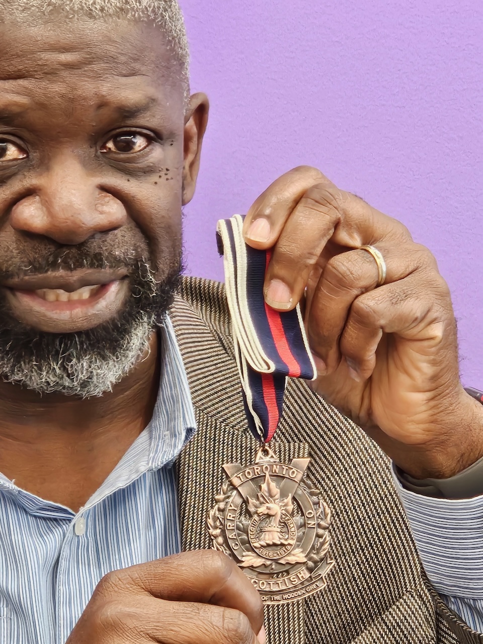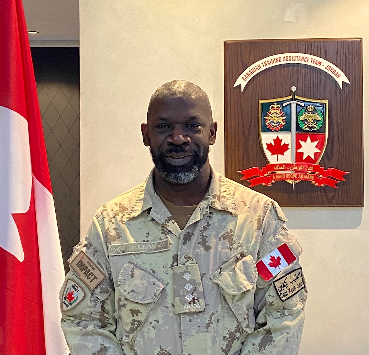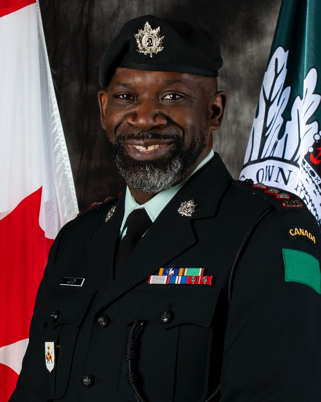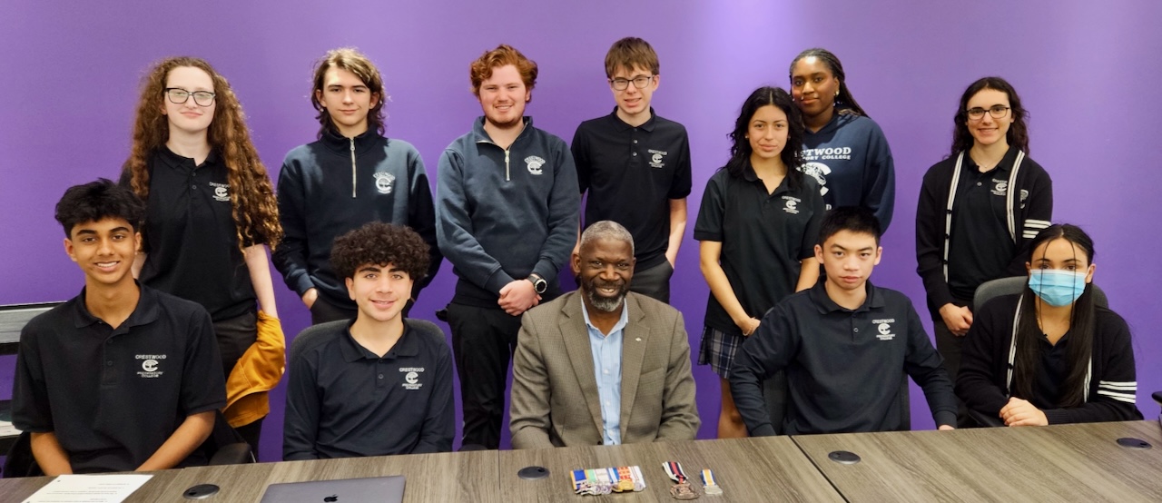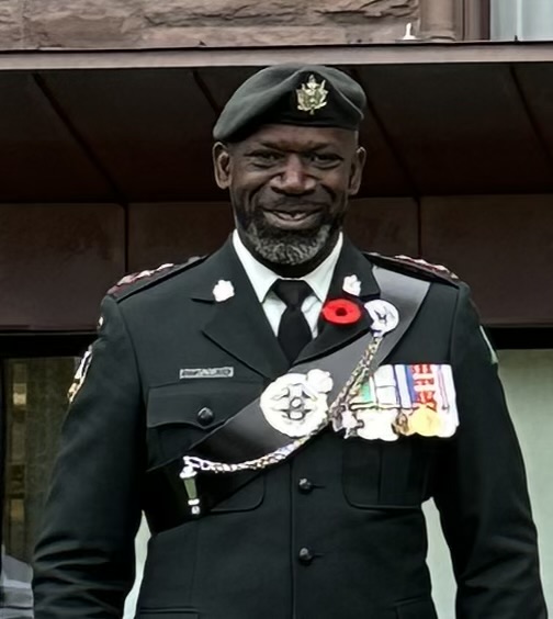 Kevin Junor was born April 8, 1963 in England to Jamaican parents who had emigrated there a few years earlier.  The family later moved to Canada and Kevin grew up in the Bellamy-Lawrence neighbourhood of Scarborough, in Toronto’s east end.  A Canadian Forces recruiting officer visited Kevin’s high school when he was 17, and Kevin decided to join up – for the summer: as Kevin noted “…it was summer that turned into forty years!” He adapted to the military lifestyle, and was off for training at CFB Borden.  His first deployment would come in the early 2000s, when in 2007 he was sent to Sierra Leone in the aftermath of a civil war.    The British headed up that mission, intended to stabilize the nation in advance of elections that were on the way.  Kevin’s job was to prepare the elements of the Sierra Leone military and police for the role they would play in the elections and after.  While he had positive memories of his time there, he did mention having to confront the realities of racism on the ground, including from other Canadian soldiers on the mission.  During that time Kevin was affiliated with the Toronto Scottish, and he fulfilled many important ceremonial and command duties as the Regimental Sergeant-Major.  A later deployment in 2020 took him to Jordan, in the Middle East, where he was also involved in duties aimed at increasing regional stability, including building a road between Jordan and Syria.  In that respect, Kevin and the Canadian Forces have maintained an important tradition and an important pillar of Canada’s postwar status as a Middle Power.  As he closed out his military career, Kevin became a member of the Queen’s Own Rifles, and he developed his interests in Canada’s Black military history, working to commemorate the contributions of Black Canadians in times of war.  That included important work on Canada’s No. 2 Black Construction battalion in the First World War, where an official government apology came after many years, thanks to Kevin and others’ efforts.  Kevin is now retired, but he remains active in his community and proud of his involvement in the Canadian Forces.  Crestwood students were able to meet Kevin for an in person interview in April 2024 at the Exchange, part of the Caledon Community Services network.