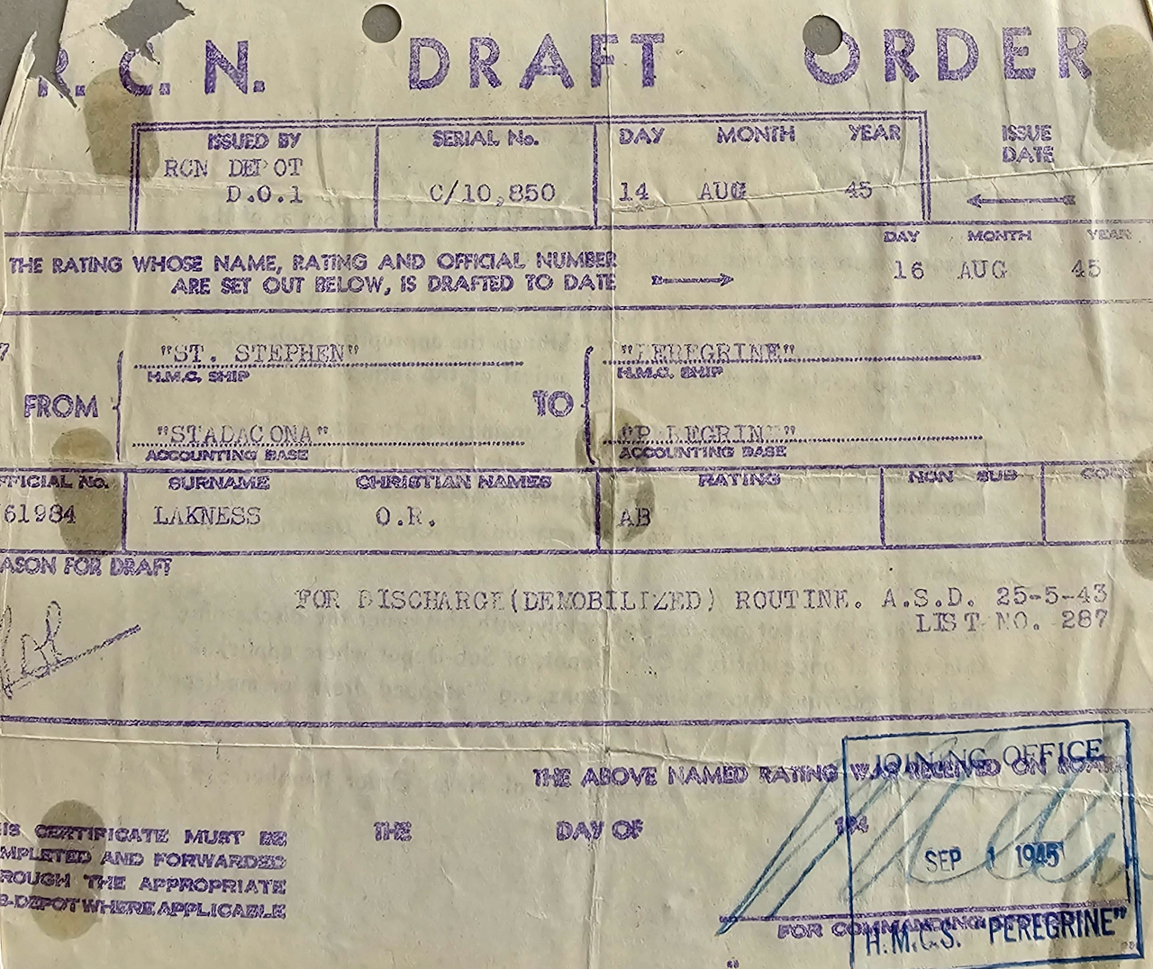Ossie Lakness was born in Govan, Saskatchewan on May 5, 1923. He grew up against the backdrop of the Great Depression in that small farming community, the youngest in a large family. Ossie remembers well those difficult early years, when dust storms and grasshopper plagues impacted the people of the Prairies. When the war came Ossie was in Grade 12, and he remembers several of the young male teachers joining up in the early days. Ossie applied for farm aid: his father was getting older, but Ossie was denied the exemption as he had an older brother. He was able to briefly attend university, and while there Ossie met and married his wife – at age 20! When the time came, Ossie chose to enlist in the Royal Canadian Navy, and he reported to Saskatoon, and then to HMCS Cornwallis in Nova Scotia, where he went through basic training. He was assigned to a frigate, the HMCS St Stephen, where he would serve as quartermaster. Ossie completed seven convoys across the north Atlantic, a critical part of Canada’s role in the Battle of the Atlantic. Canadian frigates like the St. Stephen would defend the convoy against U-Boat attacks, targeting them with depth charges and doing what they could to stop the unseen threat. He also dealt with all the other difficult conditions: the weather, the ice, the sea sickness – and occasional conflict among his crewmates. When the war came to an end, the crew of the St. Stephen escorted a number of U-boats to harbours in eastern Canada, and they were about a day outside Halifax on VE Day – so they missed the riots. Ossie took advantage of his veterans’ benefits at the end of the war, returning to university to complete his agriculture degree, which led him to a career as a farmer. He also raised his family – and was an avid curler! Ossie Lakness was interviewed over zoom by Crestwood students in November 2023.