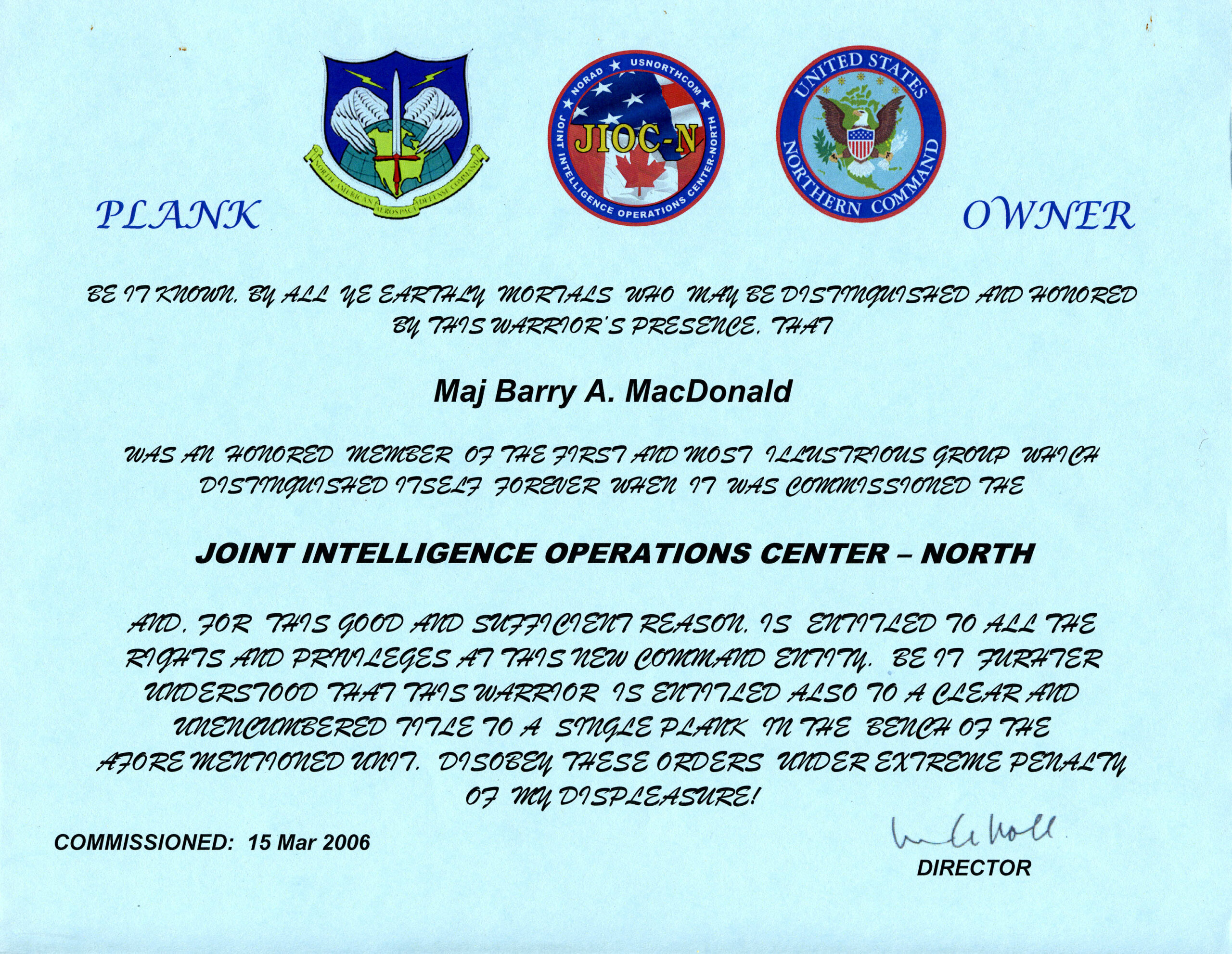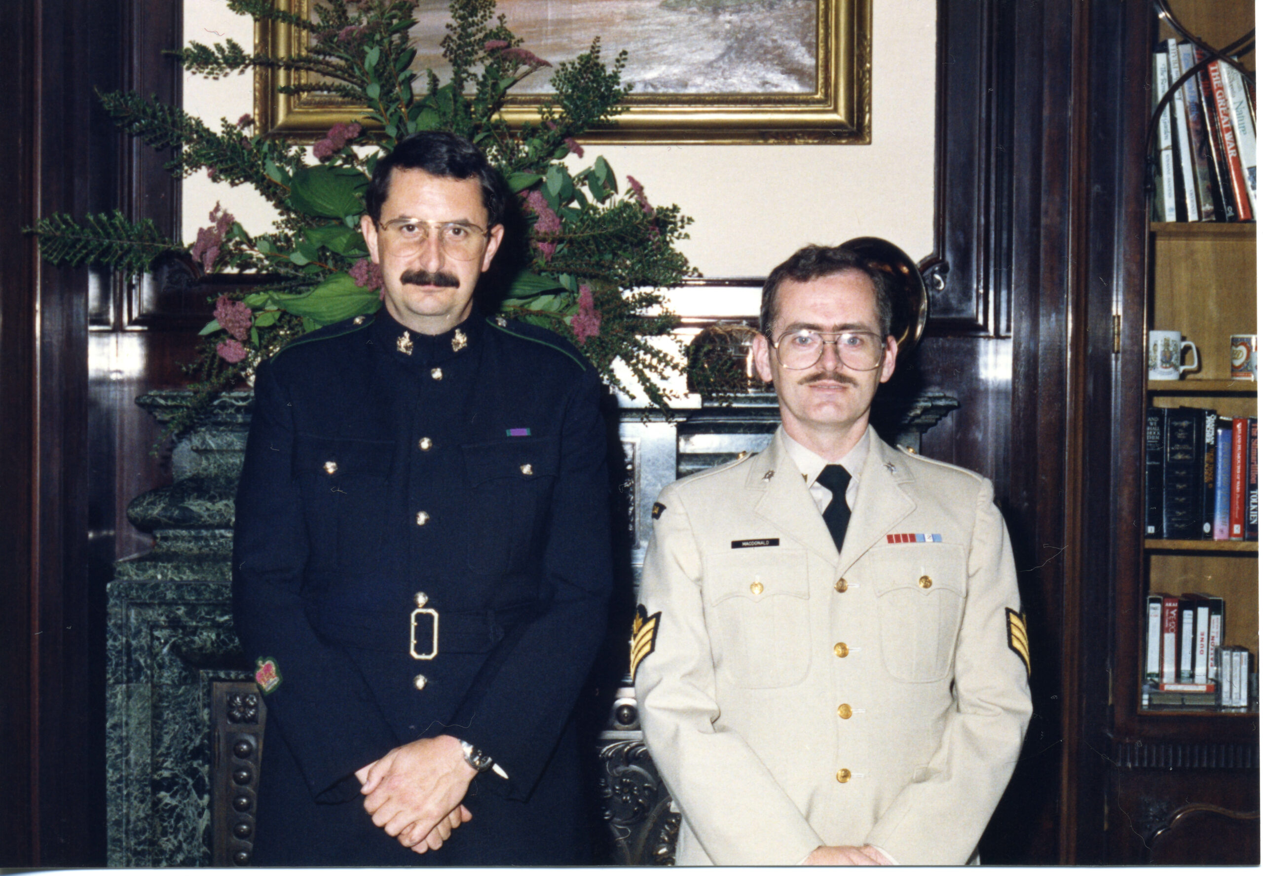 Barry MacDonald was born February 17, 1955 in Halifax, Nova Scotia.  He grew up in the Eastern Passage area of Nova Scotia, the son of a World War Two veteran.  Barry made the decision to enlist in his own right in 1971; as he was underage his parents signed on his behalf, and Barry’s career began in the militia unit of the Princess Louise Fusiliers.  He completed basic training and was set to start a path in the Canadian Forces infantry, but he had heard about other options by then, one being the Canadian Forces Security Branch, an amalgamation of the Provost and Intelligence Corps.  Barry served as an Intelligence Operator and a member of the Military Police, all as the Cold War was evolving.  Having done well in those early years Barry was asked to join the regular forces, which he did.  He continued on his pathway of intelligence work, first with the Special Service Force in Petawawa, and then in Ottawa.  In that last posting Barry was involved in 24/7 monitoring of different global threats that could have impacted Canada or its allies.  Barry had also volunteered for overseas duties at this time, and he was deployed to Cyprus in 1981 for two consecutive tours of UN peacekeeping operations.  He returned to Canada to a number of postings in Ontario – Ottawa, CFB Borden and Toronto.  His work in intelligence continued and he began teaching courses in leadership.  On a personal note, he also met his future wife Biz Carrigan during this time.  His path also opened new opportunities in overseas service too, which included a 3-year posting to the Canadian Embassy in Prague, Czechoslovakia in the late 1980s.  He and Biz had the opportunity to live behind the Iron Curtain and to see a very different side of life.  The posting to Czechoslovakia finished just as events that would lead to the Velvet Revolution were ramping up, with the fall of the Berlin Wall only a few months away.  Barry returned to Canada to Kingston, where he was posted to 1 Cdn Div HQ, and where he would be a founding member of 1 Cdn Div Int Company.  In 1993 a transfer to North Bay took place, where Barry served in the bunker 600 feet underground, monitoring Russian strategic activities and supporting the NORAD mission.  Another Ottawa posting followed, where Barry worked at the imagery centre, developing his skills alongside the ever-changing technology of his trade.  An invitation to Colorado followed, where Barry worked “inside the mountain”, doing his part to monitor North American airspace in the difficult time after 9/11.  After a few happy years in Colorado, Ottawa beckoned again, so Barry and his family returned north.  Promotion through the ranks had taken place through this time, as Barry had risen from warrant officer to lieutenant to captain and now major; soon he would retire as a lieutenant-colonel. Barry MacDonald was interviewed by Scott Masters at his home in Ottawa in July 2024.