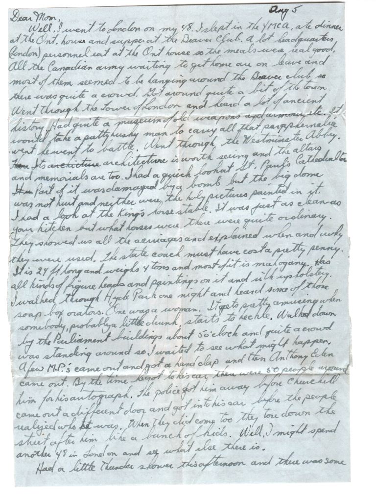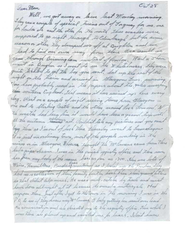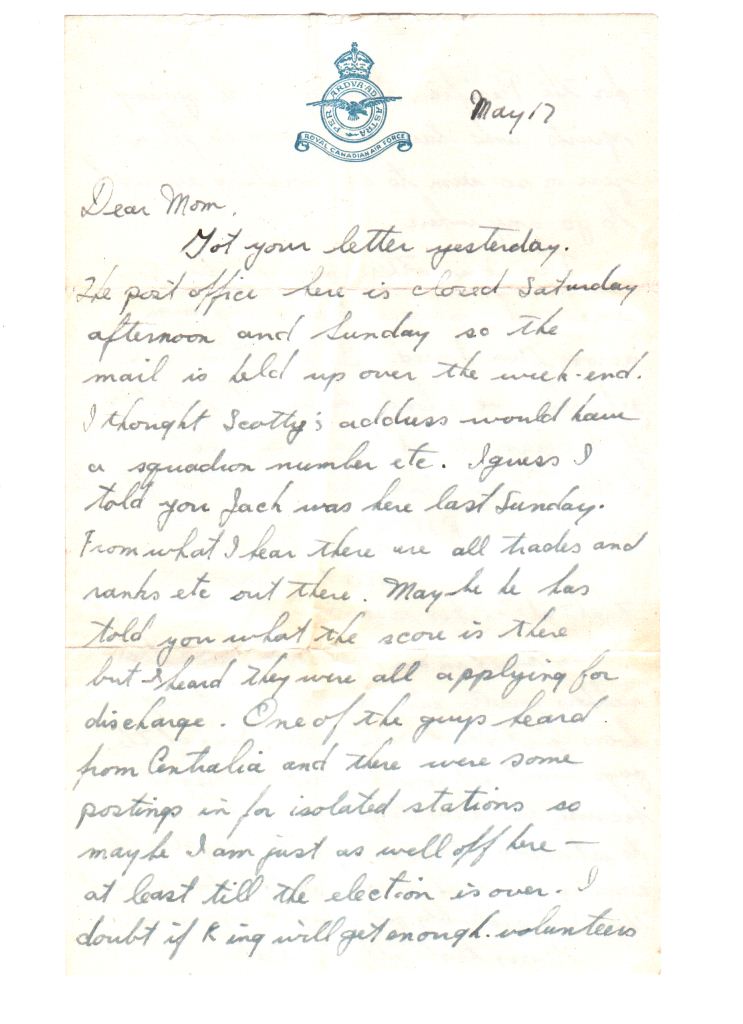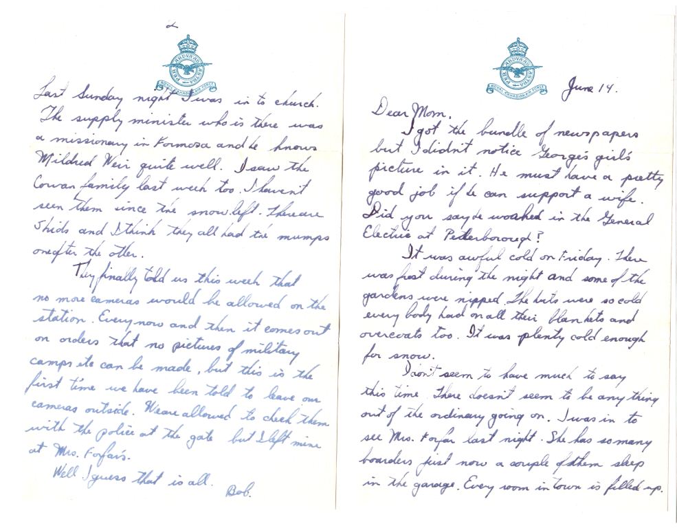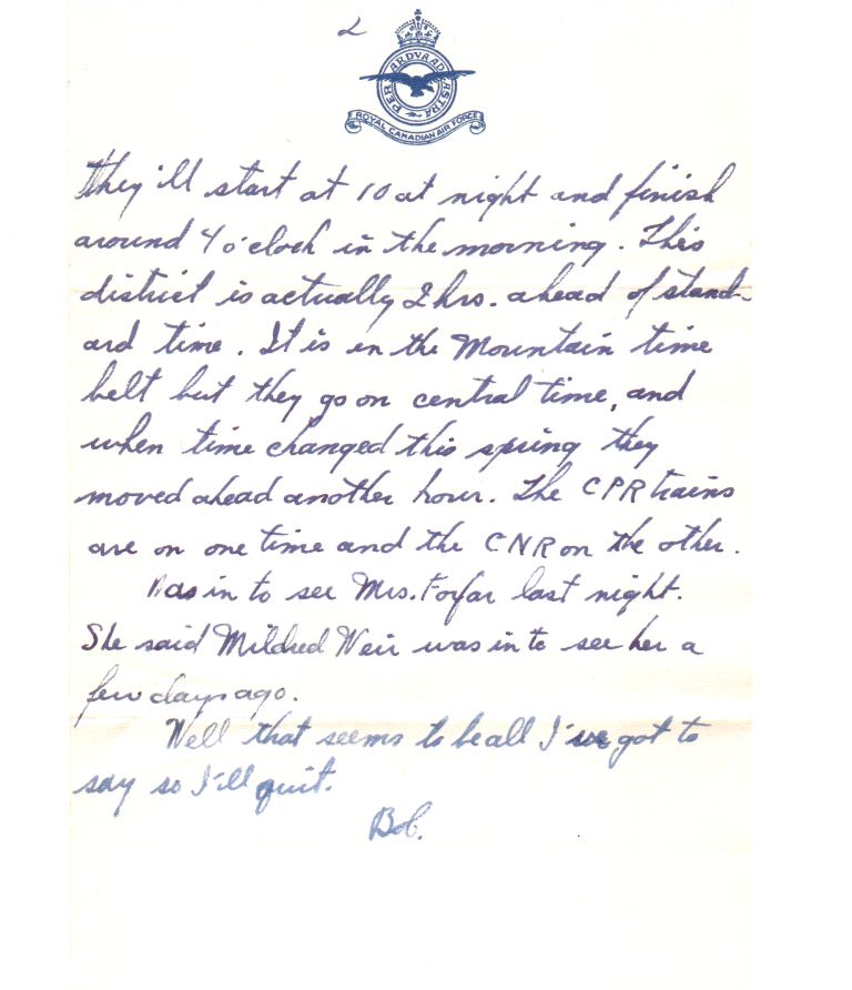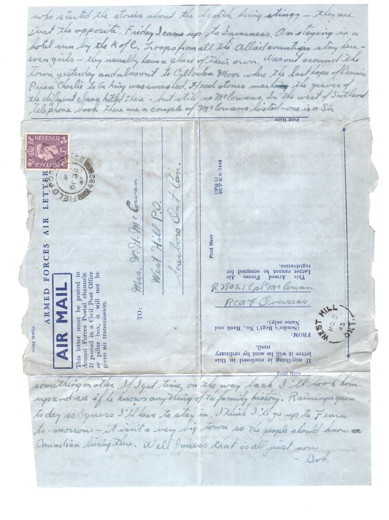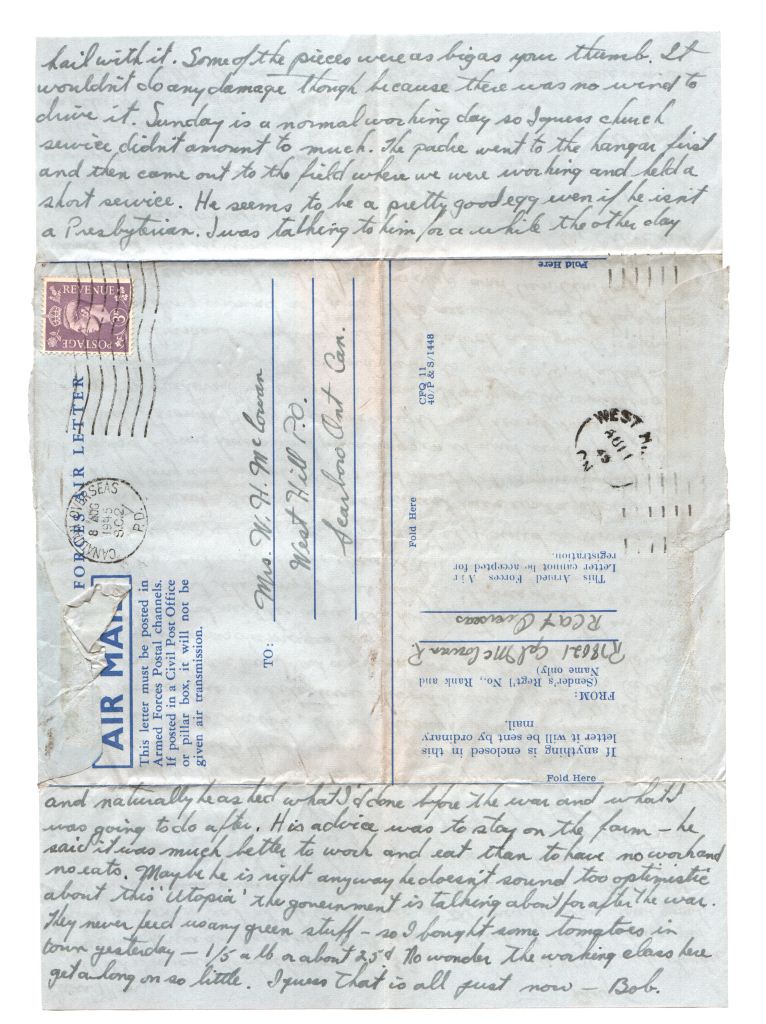 Bob McCowan was born November 9, 1917. He is from the once small farming village of Scarborough, Ontario. He saw a good deal of Canada during the Second World War years. Bob was an aeroengine mechanic, and spent his time in Canada in the Commonwealth Air Training Plan on a number of different bases. He did volunteer to go overseas and was on a ship proceeding to Britain when the war ended in Europe. He had been assigned to a Transport Squadron that had expected to go to the Far East. The war in the Pacific was still going on, but ended before the squadron ever got any farther than England. Bob was posted down to Torquay in the south of England to await ship back to Canada. He was in England for about six months and was free to travel, managing to get up as far as Inverness in Scotland. Back home, Bob worked for the Post Office in Toronto and Scarborough. In his spare time he fixed cars, something he had always enjoyed doing. He took a piece of the family farm which contained apple trees from Robert’s old orchard, and he built a house on it, facing onto McCowan Road. He married Marion Thomson, fifth generation member of the family of David and Mary Thomson, first settlers in Scarborough. Bob was a busy person, in charge of St. Andrews Cemetery, looking after a good sized garden, bowling in the summer and curling in the winter. His brother Jack was interviewed for this project in 2019, and the McCowan family shared Bob’s interview in 2024, part of their ongoing commitment to remembrance.