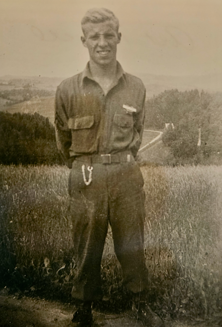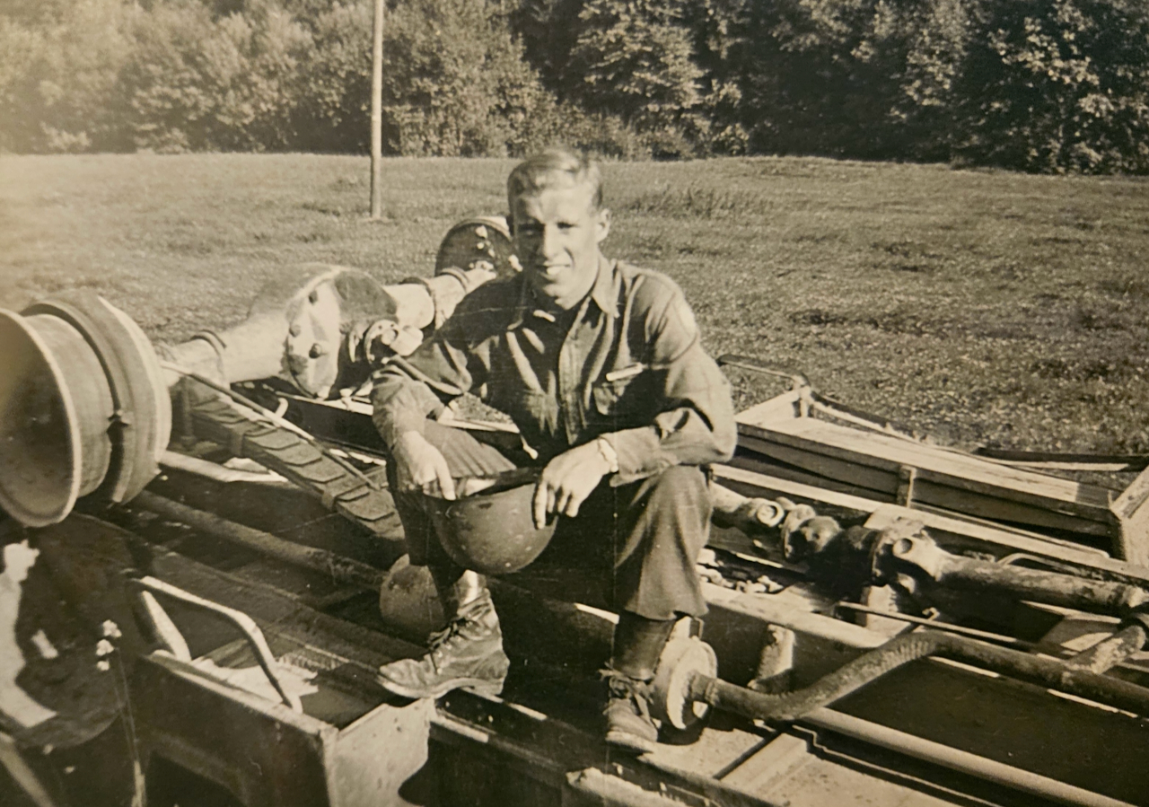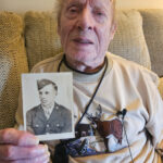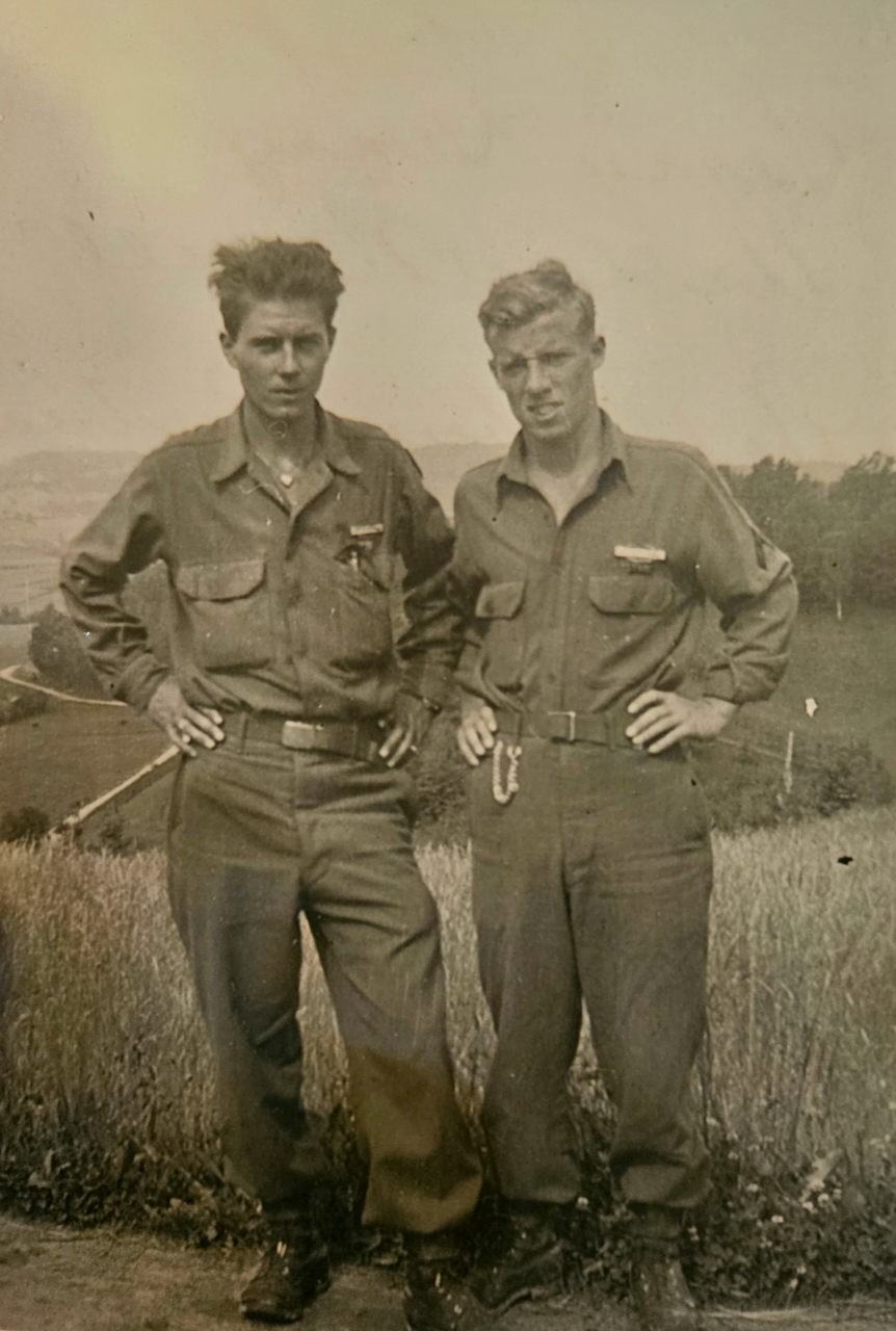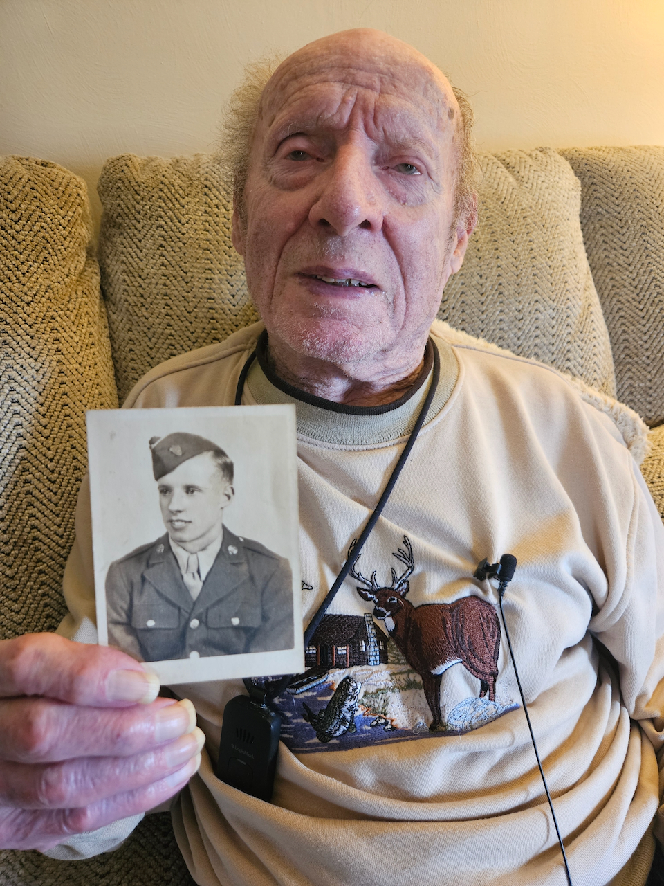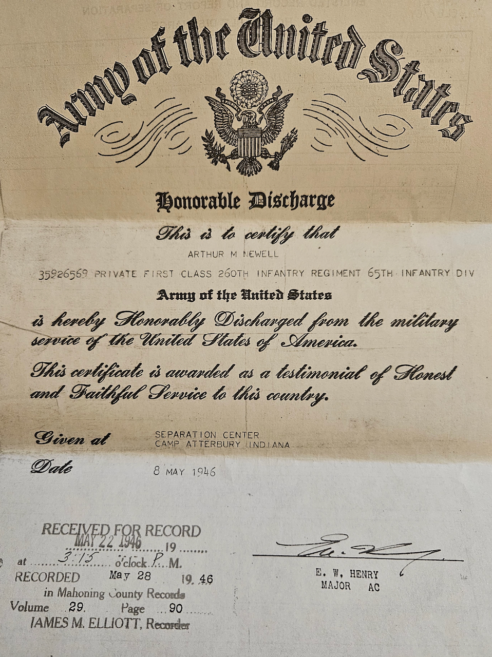 Art Newell was born November 11, 1925 in Struthers, Ohio. He grew up there against the backdrop of the Great Depression, working in a local steel mill alongside his father, a Great War veteran who became a local labor leader. Pearl Harbor would change the fate of Art’s generation: Art’s older brother and an uncle were in the war from the start, and both served in the Pacific. Because of their service, Art’s mother insisted that he wait until he was called up: Art turned 18 in 1943, and with that he was off to basic training. Art passed through a series of camps before being sent to New York, where he boarded the troop ship John Ericsson; they were supposed to sail to England, but their convoy came under U-boat attack, so they were rerouted to Le Havre, arriving in late 1944. The first stop on the continent was in Camp Lucky Strike, and from there they were shipped to the front lines in the Metz area of eastern France. Part of the 65th Infantry Division (260th Regiment, B Company), they pressed the attack in that part of France, crossing the Siegfried Line into Germany. Art and his friend Harry had volunteered as point men in their scout platoon, so they were on the leading edge of the ongoing assault. The unit saw intense action at Struth as they displaced the Germans and took prisoners as they advanced. The march through Germany and Austria also saw the liberation of many of the Nazi concentration camps, and Art’s unit took part in the liberation of both Ohrdruf and Mauthausen, two of the infamous camps where the Nazis’ inhumanity was on display. The war ended for Art in Linz, Austria; he did not get to go home right away as he was kept on for a year for the Army of Occupation. Art returned home in 1946: he was discharged and made his way back to Ohio, where he met Marcia a few years later. They married and started a family, finding their own place in postwar America. Art Newell was interviewed by Scott Masters at his home in Struthers, Ohio in March 2026.