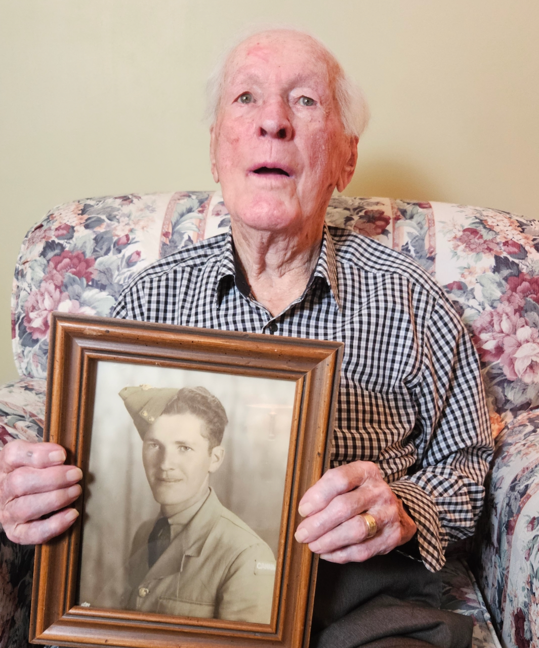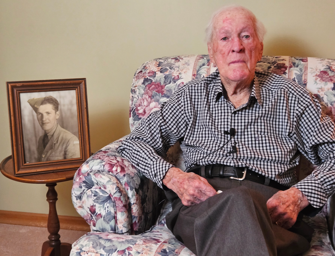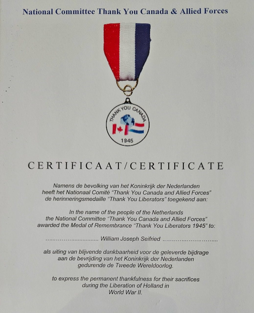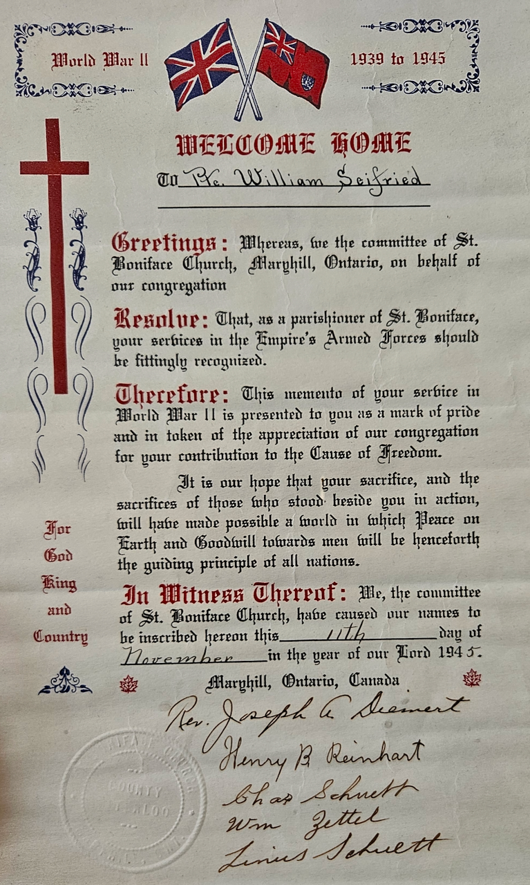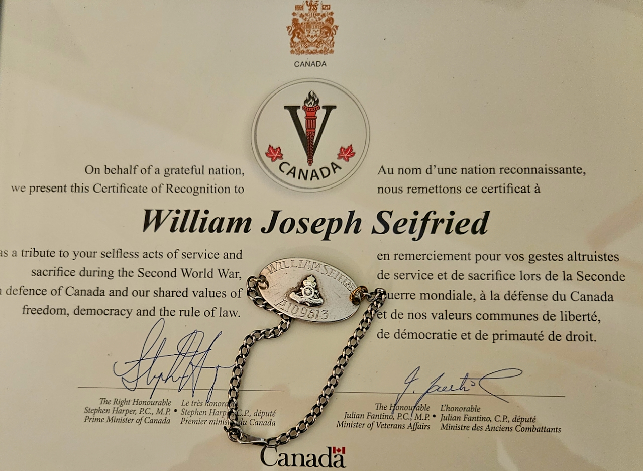Bill Seifried was born May 3, 1925 in Ariss, Ontario, a rural community. His early years were spent on a farm with his many siblings, and the family moved to nearby Guelph when Bill was 14. He and a brother worked at Leland Electric, and when his brother went into the RCAF Bill joined up too, training at Petawawa and going overseas to England in 1944. In England Bill was assigned to the Regina Rifles, one of the regiments who had taken part in the first wave landings at Juno Beach and which had fought their way through the brutal Battle of Normandy. Bill was assigned to them as a replacement soldier, and after a brief time in England he crossed the Channel and landed at Calais. He had been trained as a driver and expected to serve with an artillery unit, but as Canada’s losses were heavy he was now an infantryman. Later he would be reassigned to a scouting unit, doing reconnaissance on German fortifications. Bill was at the forefront of the Canadian units involved in the coastal push and liberating the Channel ports; as such he was in the thick of the Battle of the Scheldt and the liberation of the Netherlands. Along the way Bill got to know Major Orr, who asked Bill to be his batman; when the major volunteered for the fight in the Pacific so did Bill, and because of that the two of them were able to return to Canada in advance of many of the other troops. During that summer of 1945 Bill learned that the war in the Pacific had come to an end – and so had his service. He had married his sweetheart on his return to Canada, and the two of them went on to build a life and a family together in Guelph, finding their way in Canada’s postwar rhythms. Bill Seifried was interviewed by Scott Masters and Zach Dunn at his home in Guelph, Ontario in September 2024.