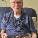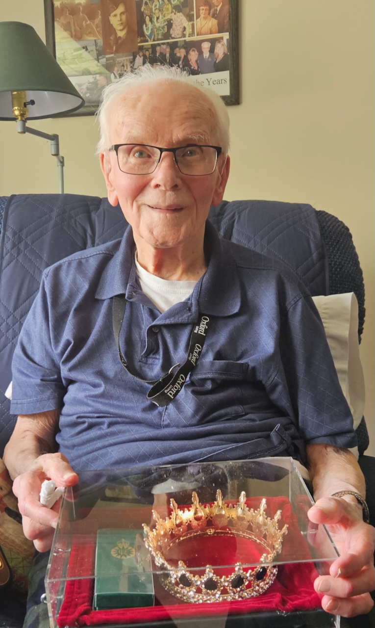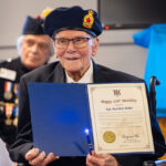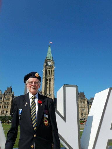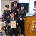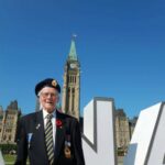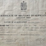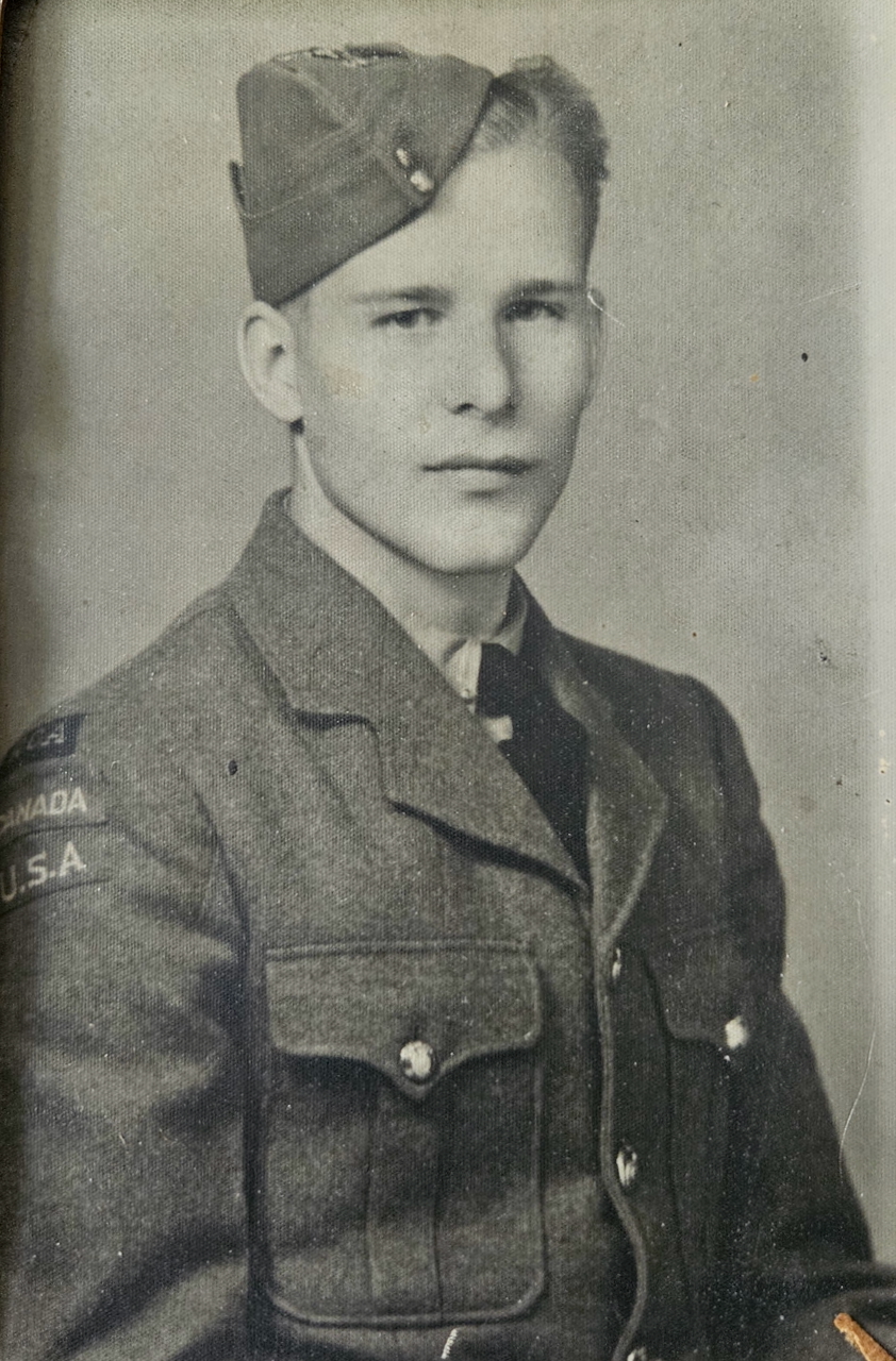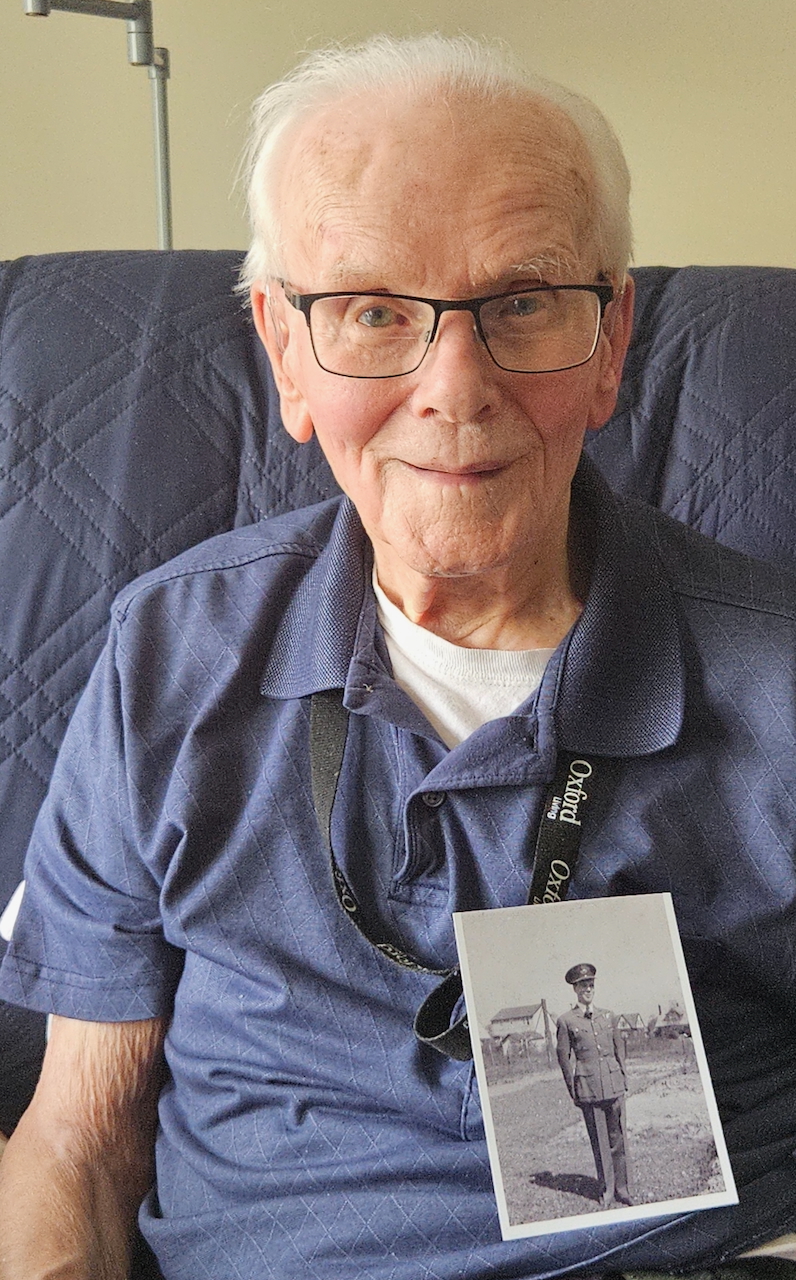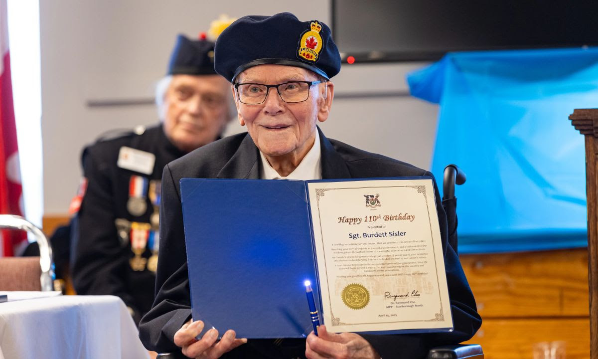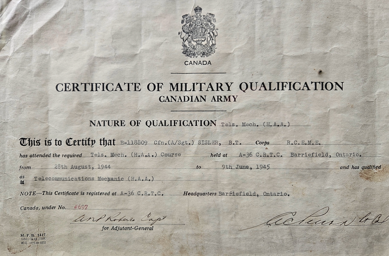 Burdett Sisler was born April 14, 1915 in Akron, Ohio. His father worked for the Goodyear Rubber Company, and early in the century he was tasked with finding a location for a factory in Canada, and the family ended up settling in New Toronto (present-day Etobicoke). That is where Burd and his siblings grew up, against the backdrop of the 1920s and 1930s. Burd attended school and did all the normal things from that time; he recalls movies and books especially. After graduation he worked as an office boy at the Goodyear plant, delivering mail from floor-to-floor. He also met a young woman named Mae, and the two of them married – in September 1939. The war literally began for Canada that same week, but – still an American citizen – Burd was for the time being not pulled into the conflict. Burd’s time to serve came in 1943 when he joined the RCAF. Not meeting the eyesight requirement, he ended up in the army. Prior to basic training he volunteered for chemical warfare trials and was exposed to mustard gas. The first half of 1944 saw him undergo gunner training. He trained for locating artillery, he trained on radar and he earned a certificate in trigonometry. Transferred once again he became a telecommunications mechanic in the Royal Canadian Electrical-Mechanical Engineers (RCEME) and advanced to the rank of sergeant. When the war in Europe ended he volunteered to go to the Pacific, but when that ended he was loaned to the Royal Canadian Ordnance Corps (RCOC) and assigned to Longue Pointe, Montreal, receiving materials returning from Europe. He was in that position until November 1946. Following discharge Burd spent 30 years with the Canadian Border Security Agency. He was interviewed at his home in Fort Erie, Ontario by Scott Masters in May 2025 – at age 110!