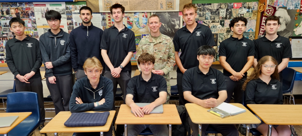 Thane Startzell is from San Antonio, Texas and is a colonel in the present day U.S. Army. He grew up in a military family, and he decided to pursue that goal in his own right, choosing to attend West Point. He was there when 9/11 happened, recognizing right away that it was a moment that would define his generation. He was commissioned in the U.S. Army Corps of Engineers in June of 2002, and as the War on Terror escalated he soon found himself sent to Iraq, the first of three deployments. While there his unit assembled barricades and did route patrol and dealt with the difficult conditions of war and insurgency in a desert setting. Startzell also deployed to Jordan during the time of the Syrian civil war, ready to play a role if circumstances demanded. Startzell’s awards include the Bronze Star Medal, the Defense Meritorious Service Medal, the Meritorious Service Medal (2 oak leaf clusters), the Army Commendation Medal (1 oak leaf cluster), the Army Achievement Medal, the Iraq Campaign Medal (3 stars), and the Global War on Terror Expeditionary Service Medal. In 2024-2025 he was at the Canadian Forces College in Toronto, and while there he was able to visit Crestwood, where he spoke to Mr. Masters’ Politics 12 class about the realities of modern warfare and the American mission in the Middle East.