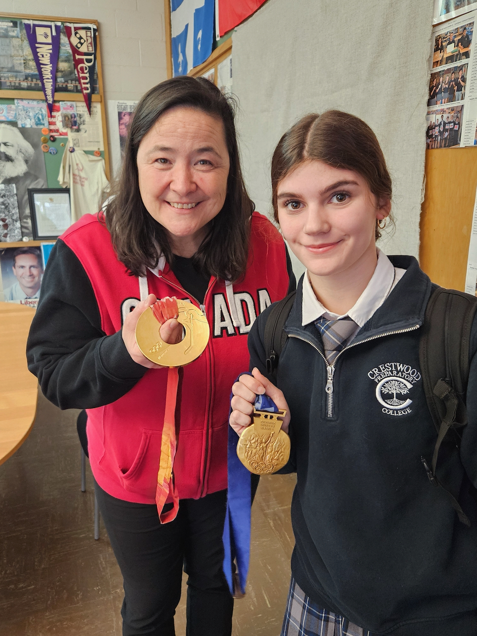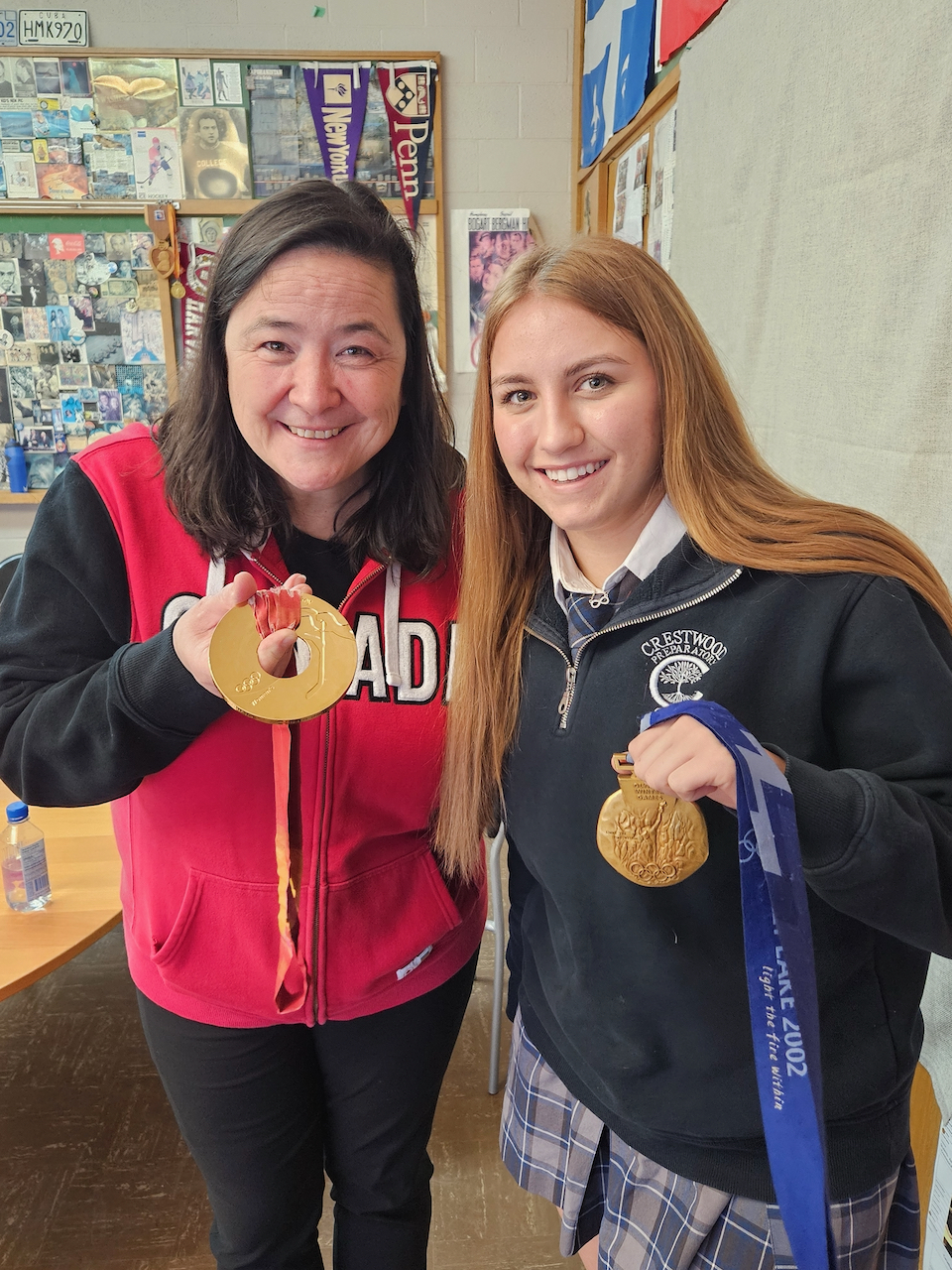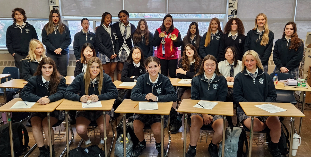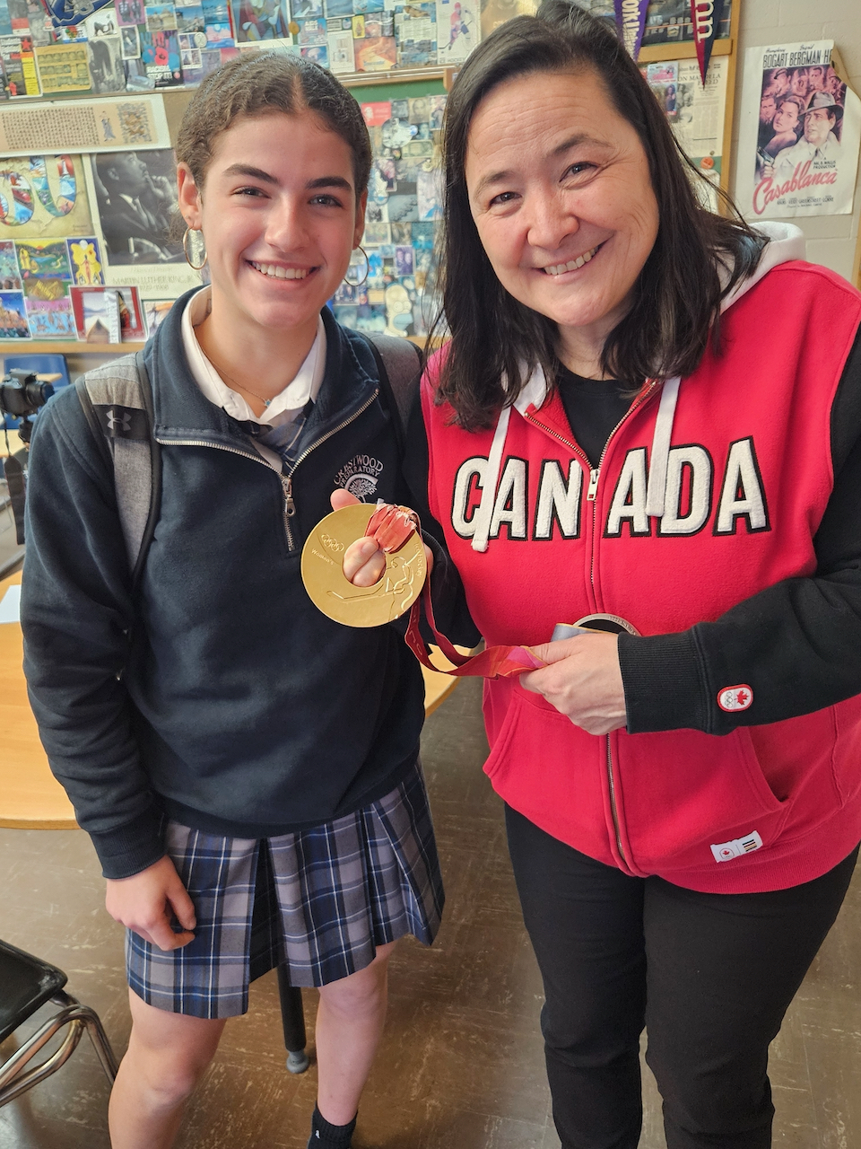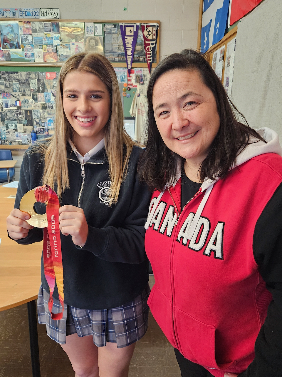 Vicky Sunohara was born May 18, 1970 in Scarborough, Ontario. Her family is Japanese and Ukrainian, and her grandparents on her Japanese side were victims of Canada’s infamous World War Two internment camps; forced to leave British Columbia they came to Ontario after the war. Vicky’s father David played hockey at the university level for Ryerson University and taught Vicky the game of hockey in the basement of the family home. He built a rink in their backyard and taught Vicky how to skate. By the age of five, Vicky was playing hockey on a boys’ team but soon after was forbidden from playing with boys and instead played on a girls’ team. Growing up, she enjoyed competing in all sports and liked being challenged on the ice and loved all types of hockey. At the high school level, she attended Stephen Leacock Institute in Scarborough. She also played many other sports, and she excelled at soccer in particular. She has stated that there were times growing up when she wanted to be someone else because of her Asian heritage; she experienced name-calling and bullying, but she fought through it with her mother’s help. She went on to an extremely successful career at the University of Toronto, and then she represented Canada at eight Women’s World Hockey Championships from 1990 to 2007, playing centre and coming away with seven gold medals and one silver medal. She also participated in the first three official women’s hockey competitions at the Olympic Winter Games. She won a silver medal at the 1998 Games in Nagano, a gold medal at the 2002 Olympics in Salt Lake City and a gold medal at the 2006 Winter Games in Turin. She has since gone on to raise a family and to coach university hockey – not to mention her own sons’ team. Vicky visited us at Crestwood in March 2024, sharing breakfast with Crestwood girls and then doing an interview with members of the girls’ hockey team.