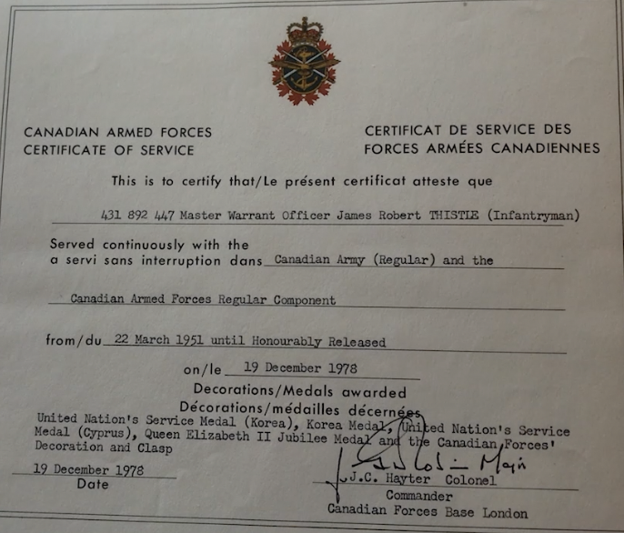 James Thistle was born February 22, 1933 in Mulmer Township, in Dufferin County, Ontario. He grew up against the backdrop of the Second World War and decided to join the Canadian Forces out of high school. He reported to Petawawa for his basic training, followed by additional training in Fort Wainwright, Alberta. By this time the Korean War had begun, and – now a member of the Royal Canadian Regiment – James was put on a draft and sent to Seattle for deployment to Korea via Japan. He arrived in Pusan and was quickly on the front lines, sent to Hill 355. There he began to experience the realities of the Korean War: the cold, the shelling, the patrols, and loss. Lucky to come through that battle, James was offered a choice of duties when they set about reforming the company, and he chose a support role in a mortar platoon. James finished his tour in that role, through to the 1953 ceasefire. They were sent home in short order, and James had not intended to re-engage, but a considerable amount of KP duty changed his mind! He reenlisted and asked to go on a jump course, for which he was sent to Rivers, Manitoba; the next stops included Churchill and Gagetown. James also did several stints on NATO bases in Germany, alternating between there and Camp Ipperwash in the early 1960s; during this time he married and began his family too. He additionally did several UN peacekeeping tours in Cyprus, and was stationed at a variety of camps across Canada as he rounded out his career in the military in the era that became known as the “Golden Age of Canadian Foreign Policy”. We thank Zach Dunn from Global Veteran Stories for his introduction to James Thistle; see his Veteran Interview Stories here – http://GlobalVeteranStories.com.
