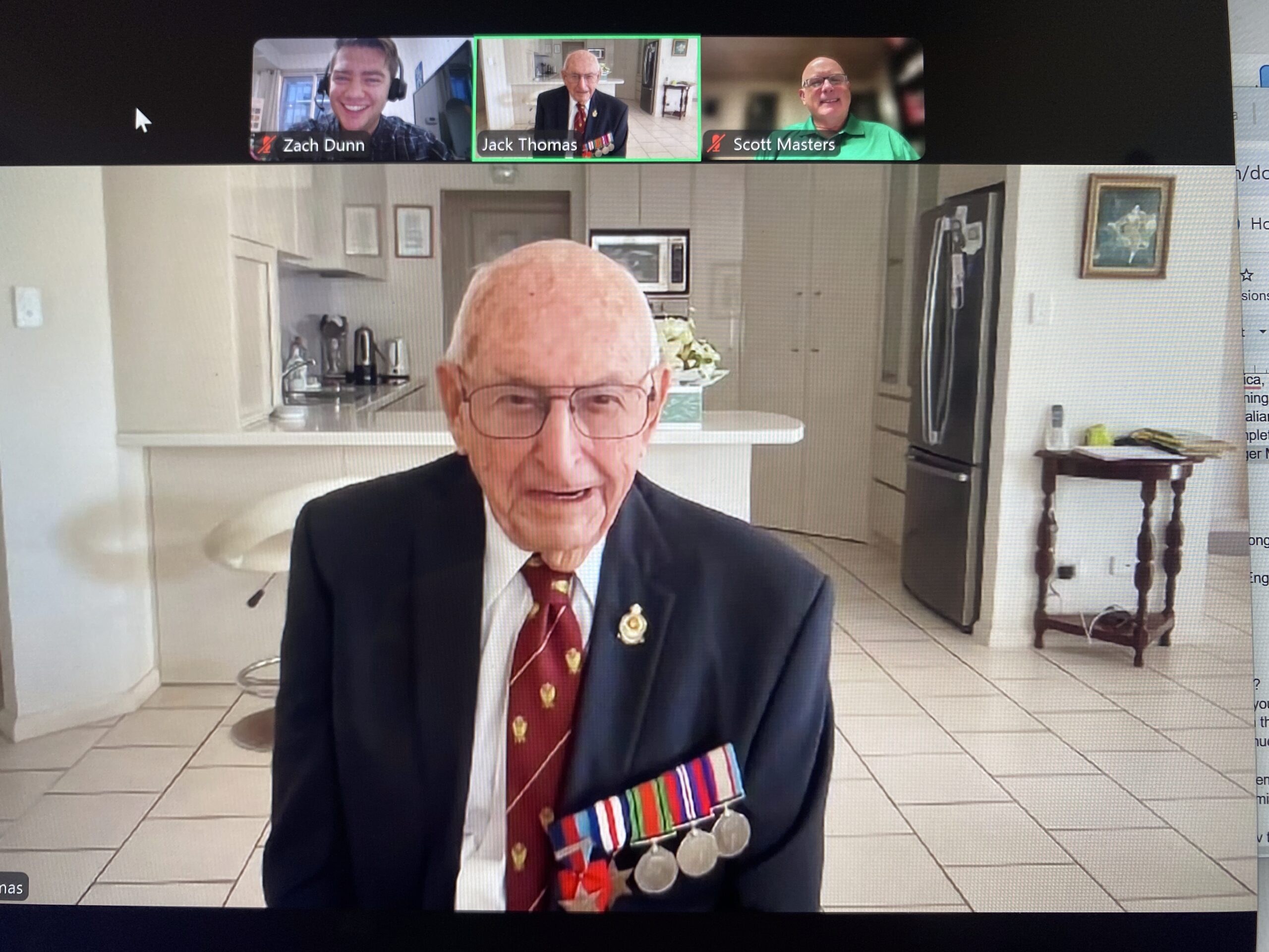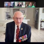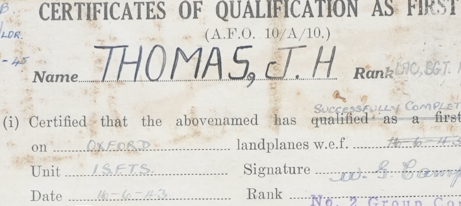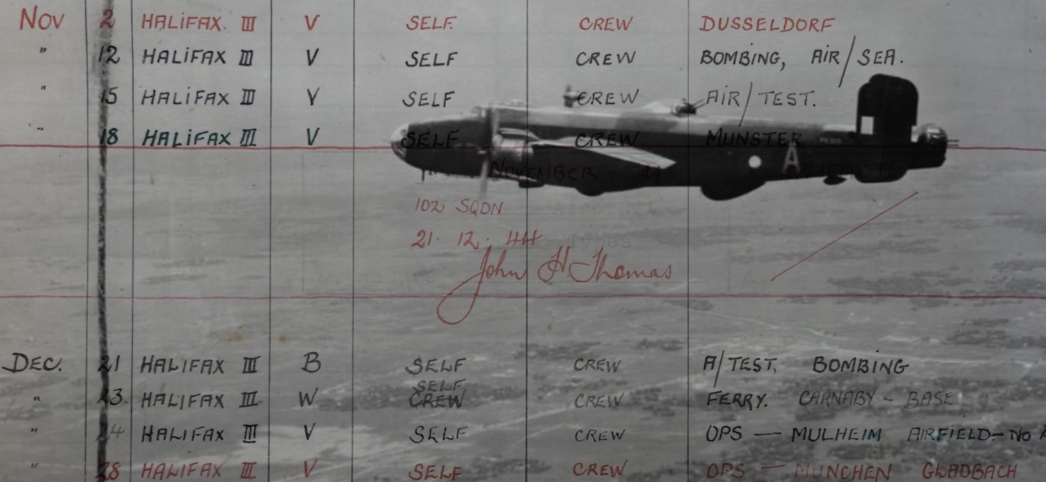 John Henry Thomas – Jack – was born September 14, 1923 in Sydney, Australia. He grew up there during the difficult days of the Great Depression, attending school and playing sports. He recalls that the war came to Australia on September 4, 1939, and that from the beginning he and his friends were aware of the conflict – and that their high school helped to prepare them for the inevitable. During high school Jack worked in war-related industry through the Manpower Directorate. When his turn to be called up came Jack opted for the Royal Australian Air Force (RAAF), and as he was 18 by the time of Japan’s entry into the conflict he enlisted with his mother’s permission and began his training in the Sydney area. The Empire Training Plan took him to a number of flight schools, and Jack got his wings and headed to Brisbane, where a troop ship took him to San Francisco. They spent a few days there and boarded trains that took them across the US to New York, where they boarded the Aquitania troop ship to head across the Atlantic. They arrived in Scotland without incident, heading south to Brighton. Additional training followed for Jack as he went through an Operational Training Unit and a Heavy Conversion Unit getting ready for the 4-engine bombers. Jack then reported to 102 Squadron at RAF Pocklington, where he and his crew were assigned to a Halifax bomber. They began their missions with attacks on V2 launch sites and also did coordinated attacks with ground forces as part of the Battle of Normandy. The operational flights continued and they began to strike targets deeper into Germany, encountering flak and other dangerous elements of the air war over Europe. Jack gives a remarkable mission-by-mission analysis here, using his logbook to go into details from 80 years ago! Jack completed 34 missions, after which he took medical leave for a tonsillitis operation followed by some well-earned travel time in Ireland. Later in 1945 he returned to Australia, ready to make his mark in the postwar world. Jack Thomas was interviewed by Zach Dunn and Scott Masters in September 2025.