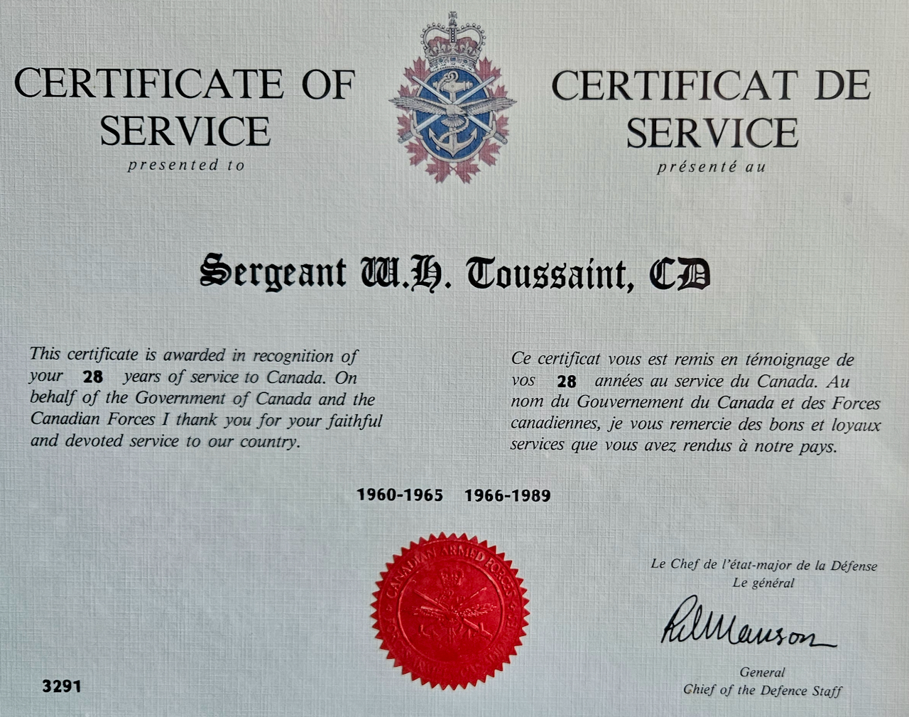 William (Bill) Toussaint was born February 8, 1947 in Sydney, Nova Scotia. His father had emigrated from Grenada before the Second World War, looking for work in the region’s steel plants. Bill grew up in that multiracial community, in a family that had developed a military reputation (one of his uncles was in the First Special Services Force, or Devil’s Brigade). Bill finished school after Grade 11, and after working for a time he made the decision to join the Canadian Forces. After basic training, he went to Kingston, where he was trained at the REME school, where he developed his technician skills. His first posting would be Gagetown, New Brunswick, where he would take courses and tests to move up through the ranks. Bill was posted at a variety of bases all across Canada, and as his career unfolded during the Cold War he was posted overseas on a number of occasions too. Along the way Bill had to confront the reality of racism that was ever-present in the Canadian Forces: he mentioned that his first fight took place when he was in basic training, and it would be an unfortunate recurring point in his time in the forces. He also had to confront the frustrating bureaucracy that is part of military life: he was for example sent to Germany attached to the Van Doos – a French-speaking regiment – and he did not speak French. His time in Germany came as part of a NATO deployment, and Bill recalls he was not fully trained when he went; vehicle maintenance and other tasks had to be learned on the job, and from training manuals. On his return to Canada, he was stationed in London, Ontario, where he caught up on his education and changed trades to become a refrigeration technician. With that new skill Bill was stationed on a number of radar bases in Canada, keeping those Pine Tree and DEW line installations in working order. His skills were also called upon in the 1970s on UN missions, and on two occasions Bill served as a peacekeeper in Egypt during that difficult decade. Bill eventually made the decision to leave the military, but he has remained an active member of the Legion, where he has served as a branch president and service officer. Bill Toussaint was interviewed by Scott Masters at his home in Stratford, P.E.I. in July 2024.