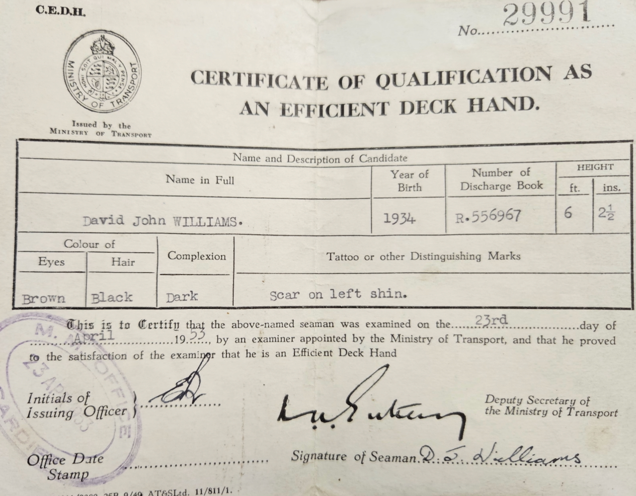 David Williams was born October 24, 1934 in Cardiff, Wales. He grew up against the backdrop of the Second World War, in which his father served in the Merchant Navy. His father served on three separate ships that were torpedoed, and the family saw him infrequently.  The Blitz hit Cardiff – a major port – so David and his brothers were evacuated to relatives in the countryside, where they continued their schooling, albeit with some interruption.  David’s mother was Welsh, and his father was from Nigeria, and when his father was in hospital he met his future wife, then a nurse’s assistant. Being biracial in 1940s Britain posed issues for David at times, but he recalls his own community being quite multicultural.  When he finished school he tried out a few different things before settling on the merchant navy; training took place over 10 weeks in Cardiff, and then he joined his first ship.  That ship was the Sugar Transporter, and David made multiple trips to Jamaica, serving as a deckhand and in navigation.  Over his 20+ year career David served on 38 ships and visited dozens of countries all around the world, from Britain to North America to the Indian Ocean, and along the way he experienced the cultures and conflicts associated with those many places.  David Williams was interviewed by Scott Masters at Legion Branch 60 in Burlington, Ontario, courtesy of the Burl-Oak Naval Veterans.
